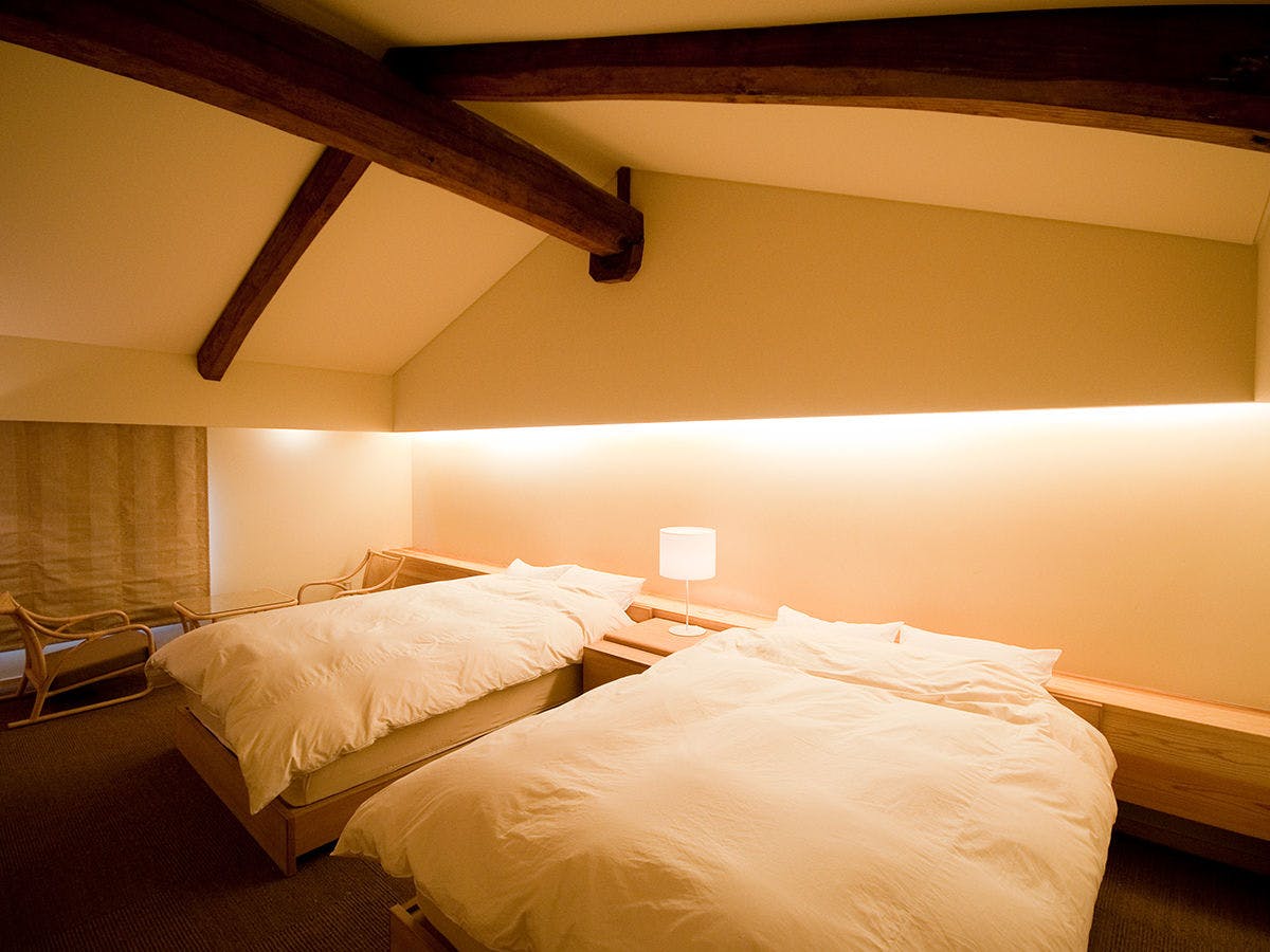 明治時代の土蔵をリノベーションした全2室のメゾネット。建物は2階建てで、2階に寝室(ダブルベッド2台)、1階のお座敷にお布団を敷いて最大3名様までご利用いただけます。