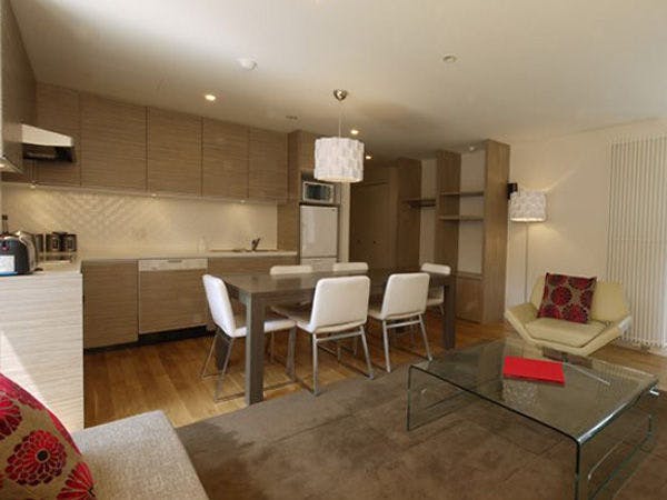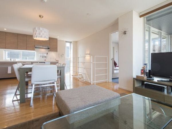 12時チェックアウト。広いリビングダイニングやプライベートバルコニーがあり、ゆったりとした空間を楽しむことができます。エレベーター完備。無料の洗濯乾燥機完備