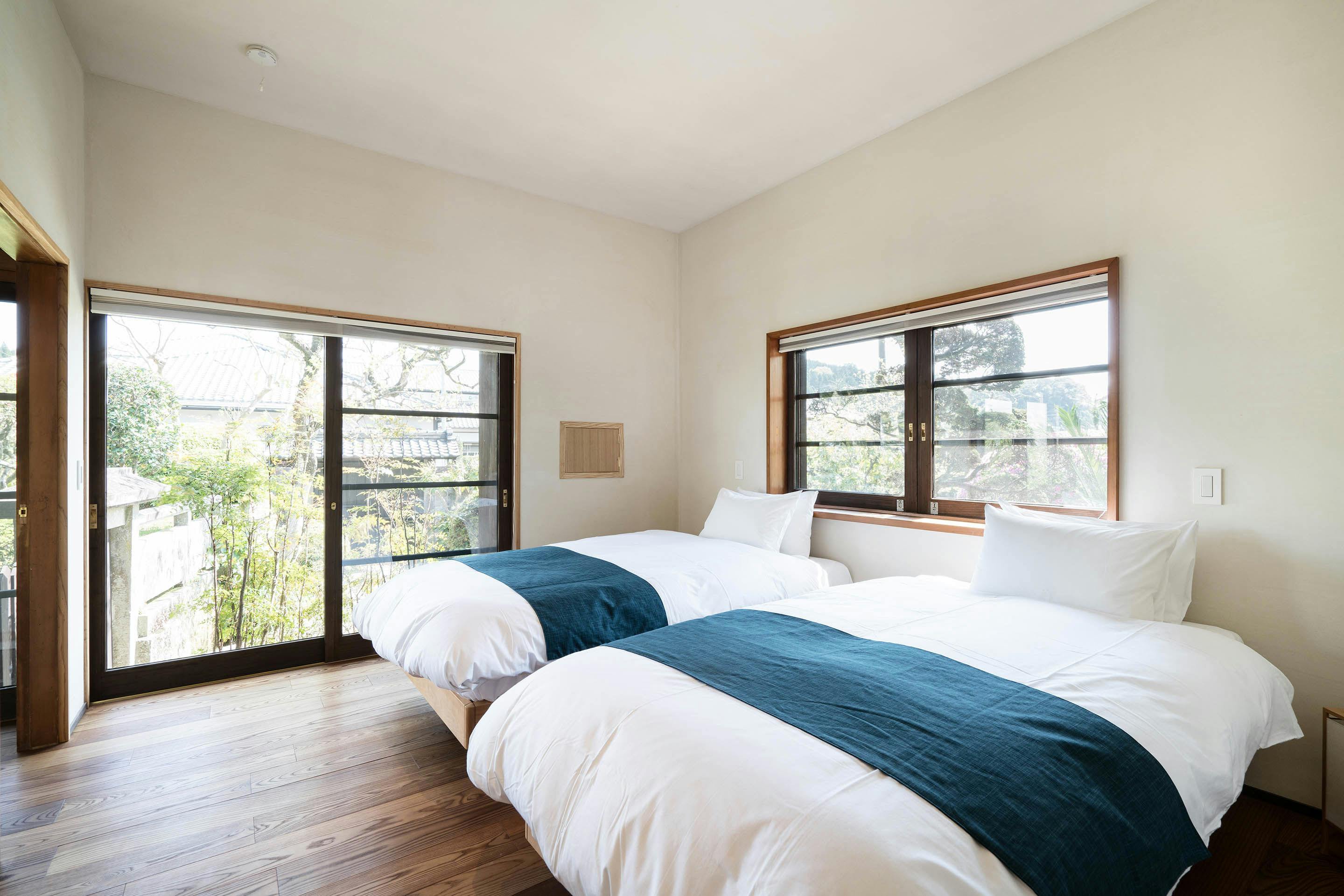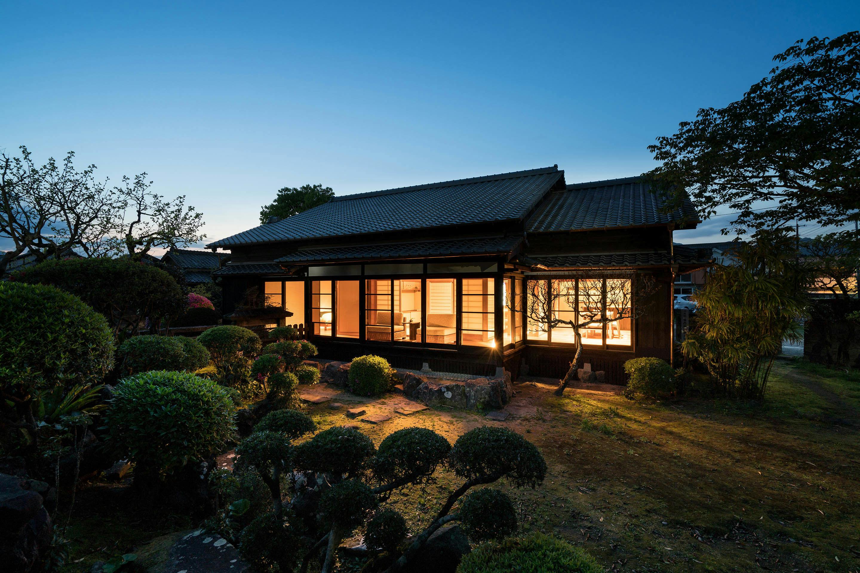 勝目邸は武家屋敷様式の宿で、枯山水式の庭園が有名です。その庭は18世紀に造られたといわれており、宮崎県によって名勝として指定されています。邸宅の敷地はおよそ1100平米ほどで、石垣によって囲まれ、伝統的な石の門がございます。時を経ても変わらない美しさが宿の天井や装飾などに見られるだけでなく、高野槙を使った大きな浴槽や、枯山水の庭を楽しめる縁側に置かれたラウンジチェアなど、贅沢な設備を取り揃えております。