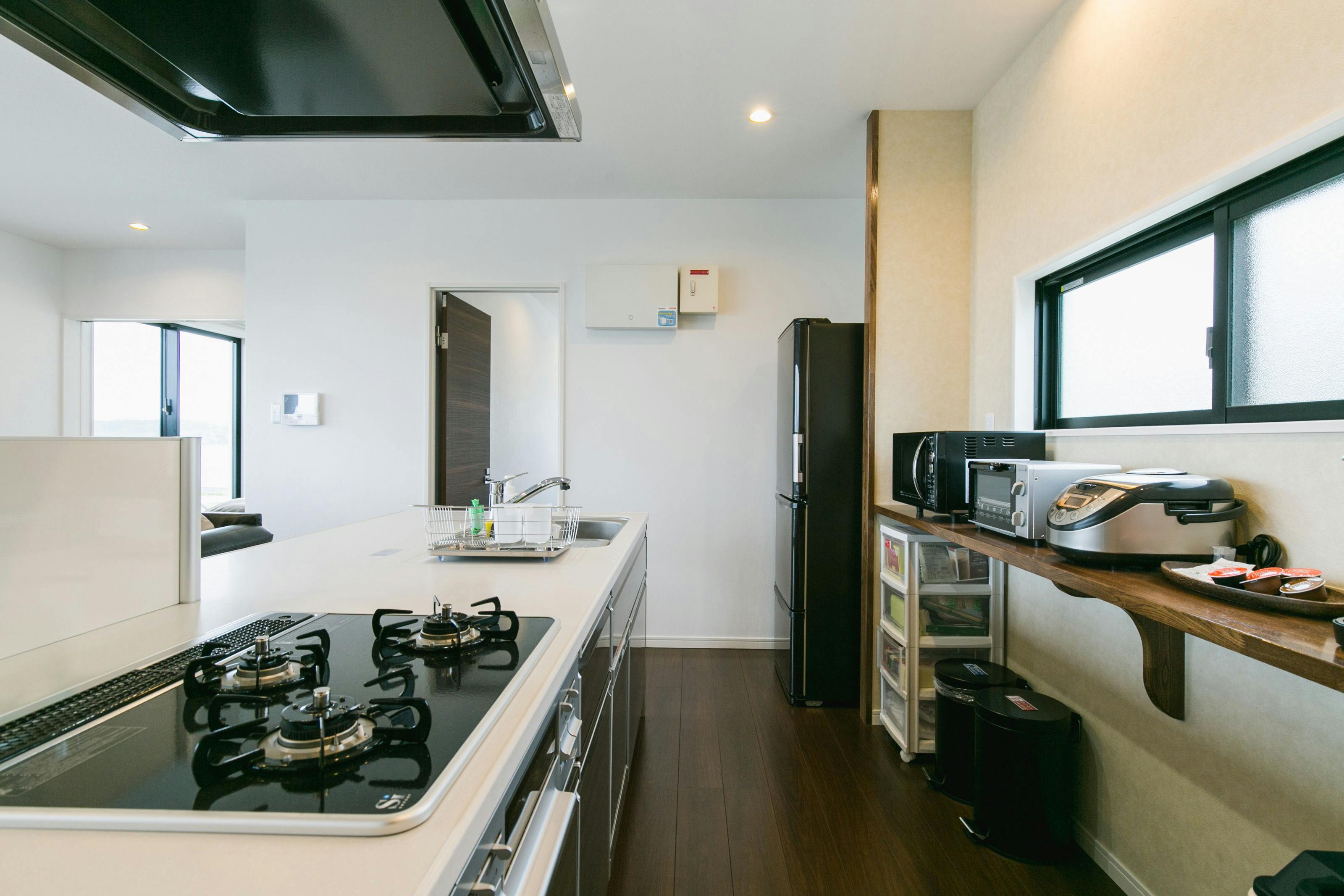 キッチン(冷蔵庫/ガスコンロ、/電子レンジ/炊飯器/電気ケトル/調理器具/お皿大中小とグラス、スプーン、お箸、フォークは最大定員分の用意あり)