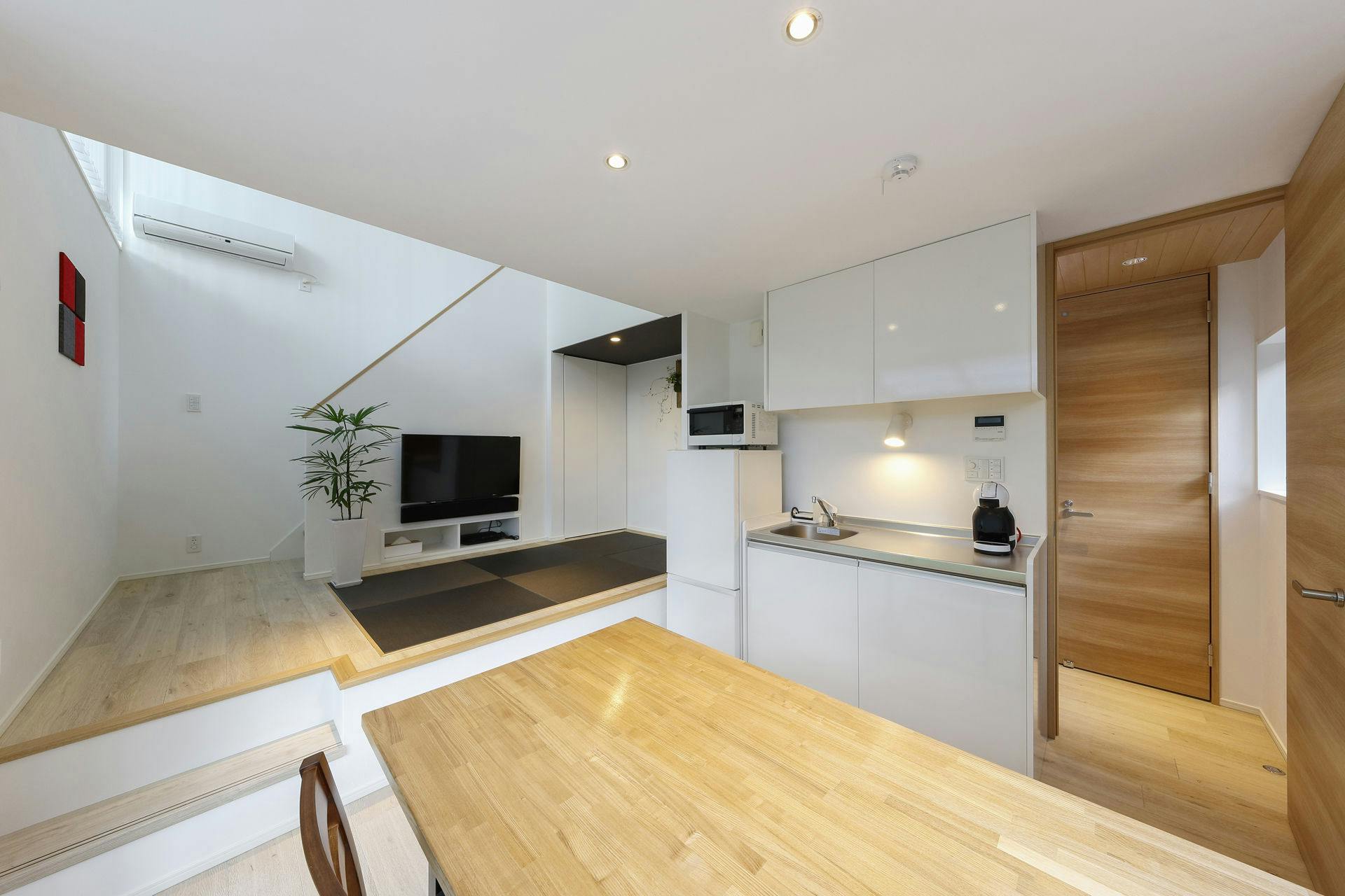 1階には畳の小上がりが付いており、腰掛けたり寝転んだりとごゆっくりお寛ぎいただけます。