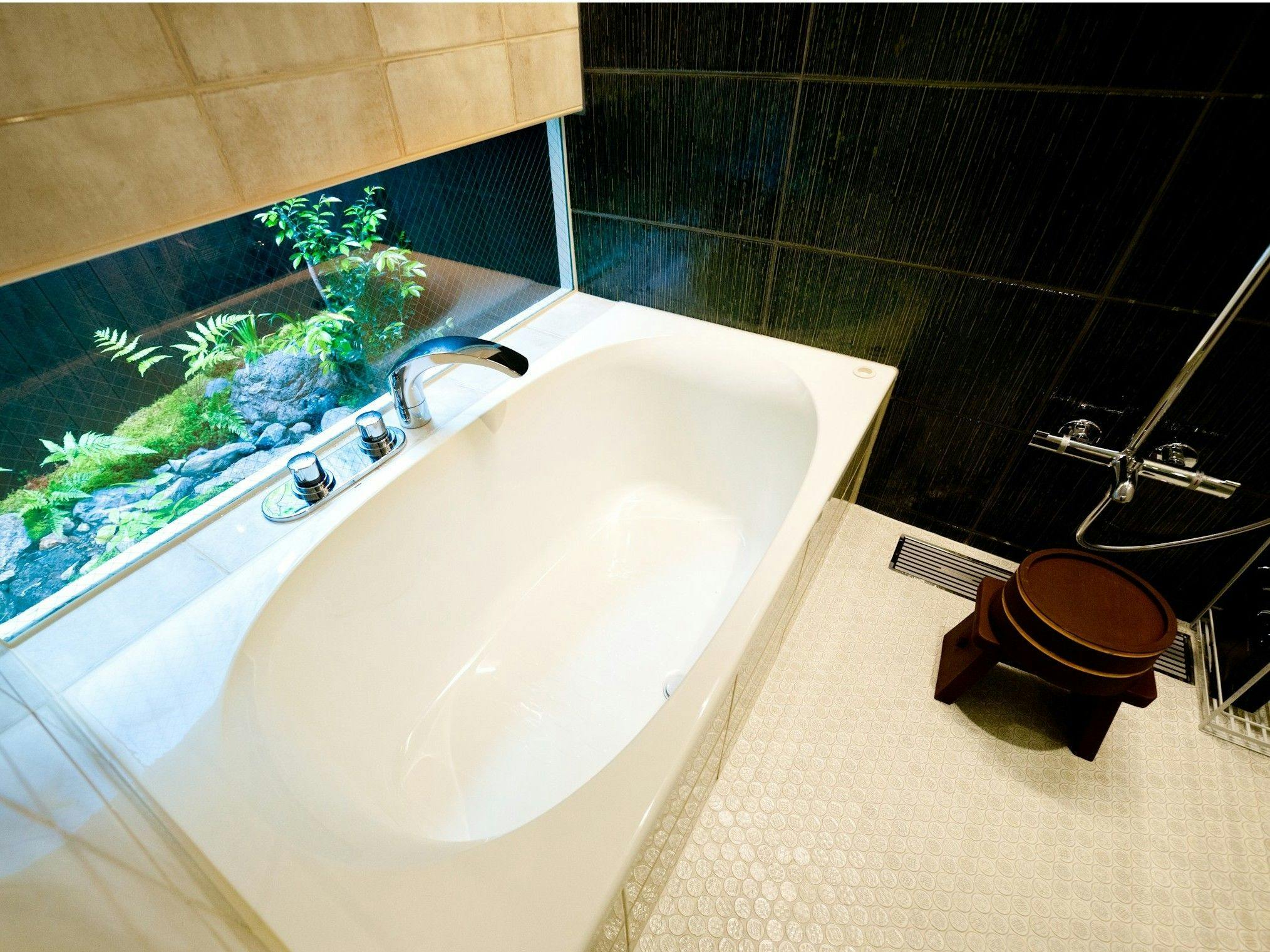 坪庭を望む浴室は大き目のバスタブのゆったり設計。充実のバスアメニティやオリジナルコスメ「京うらら」シリーズをご用意。やさしい洗い心地をお試しください。