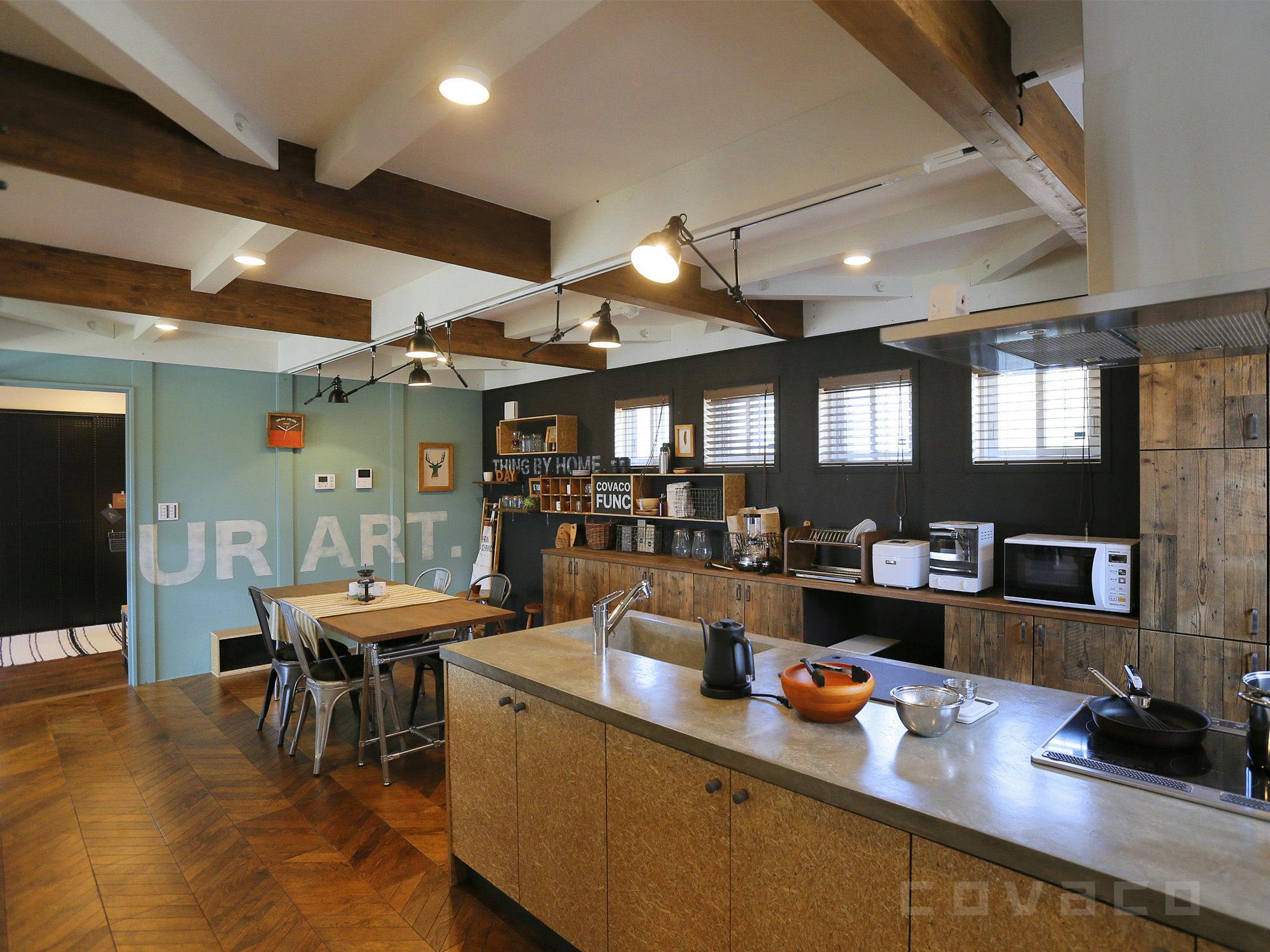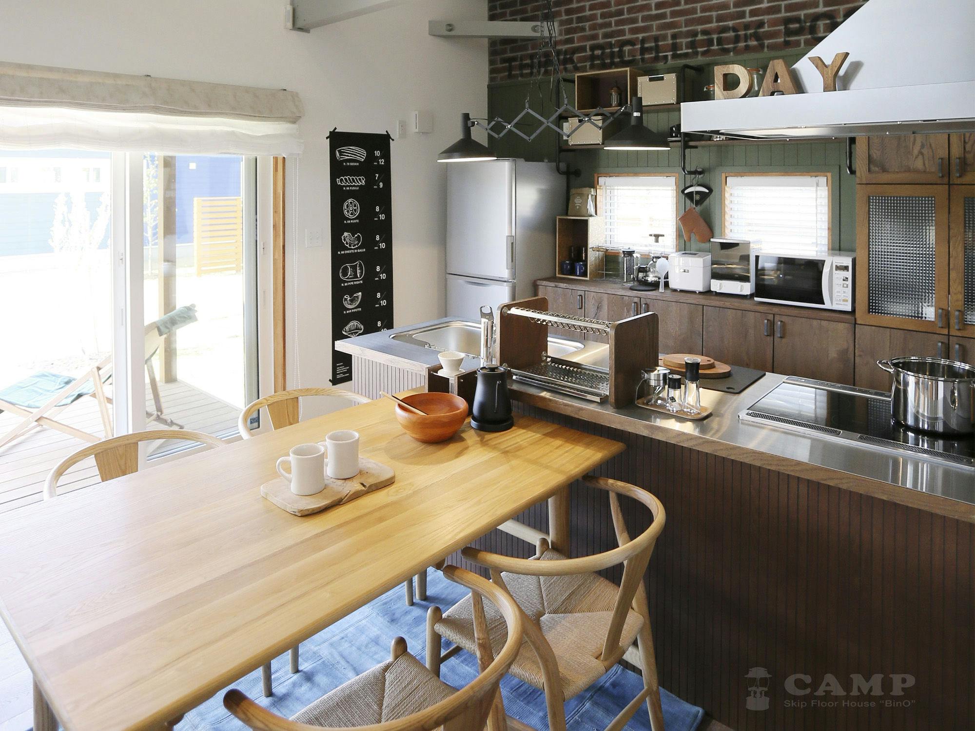 ヴィンテージテイストの無垢の床材や、キッチンにあしらったレンガの壁など、
