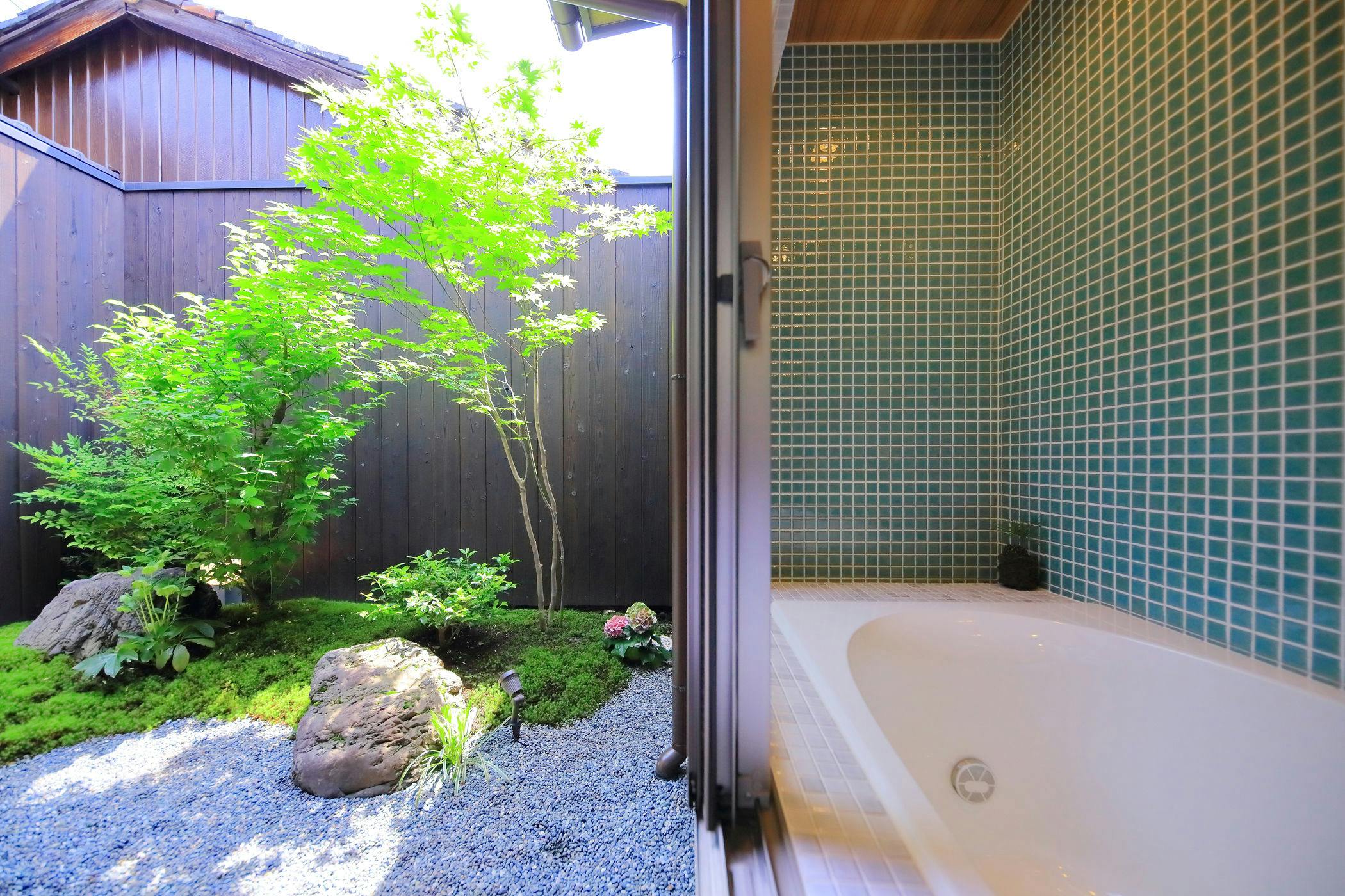 透き通るような青い陶器タイルの浴室で、窓を開放し、露天風呂気分でゆったりとくつろいでいただけます。