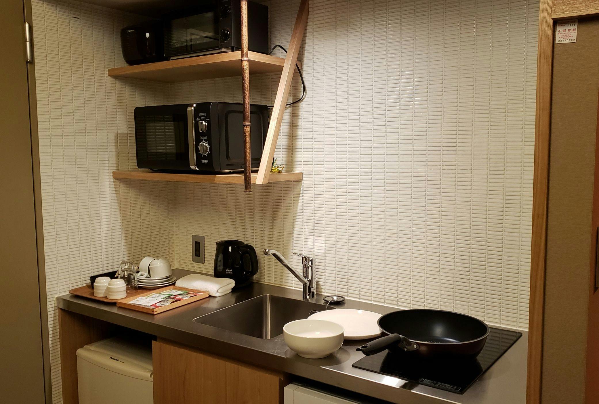 電子レンジ・オーブントースター・IHクッキングヒーター・冷蔵庫・カトラリー(フォーク、スプーン、ティースプーン、お箸)・皿・フライパン・食器洗い用洗剤・炊飯器