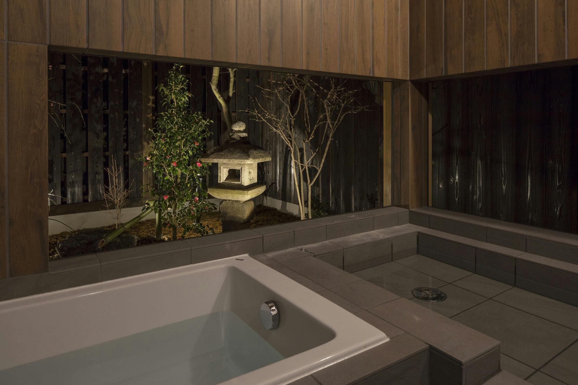 1階:リビングダイニング、テレビ、キッチン、和室、浴室、洗面、トイレ、坪庭