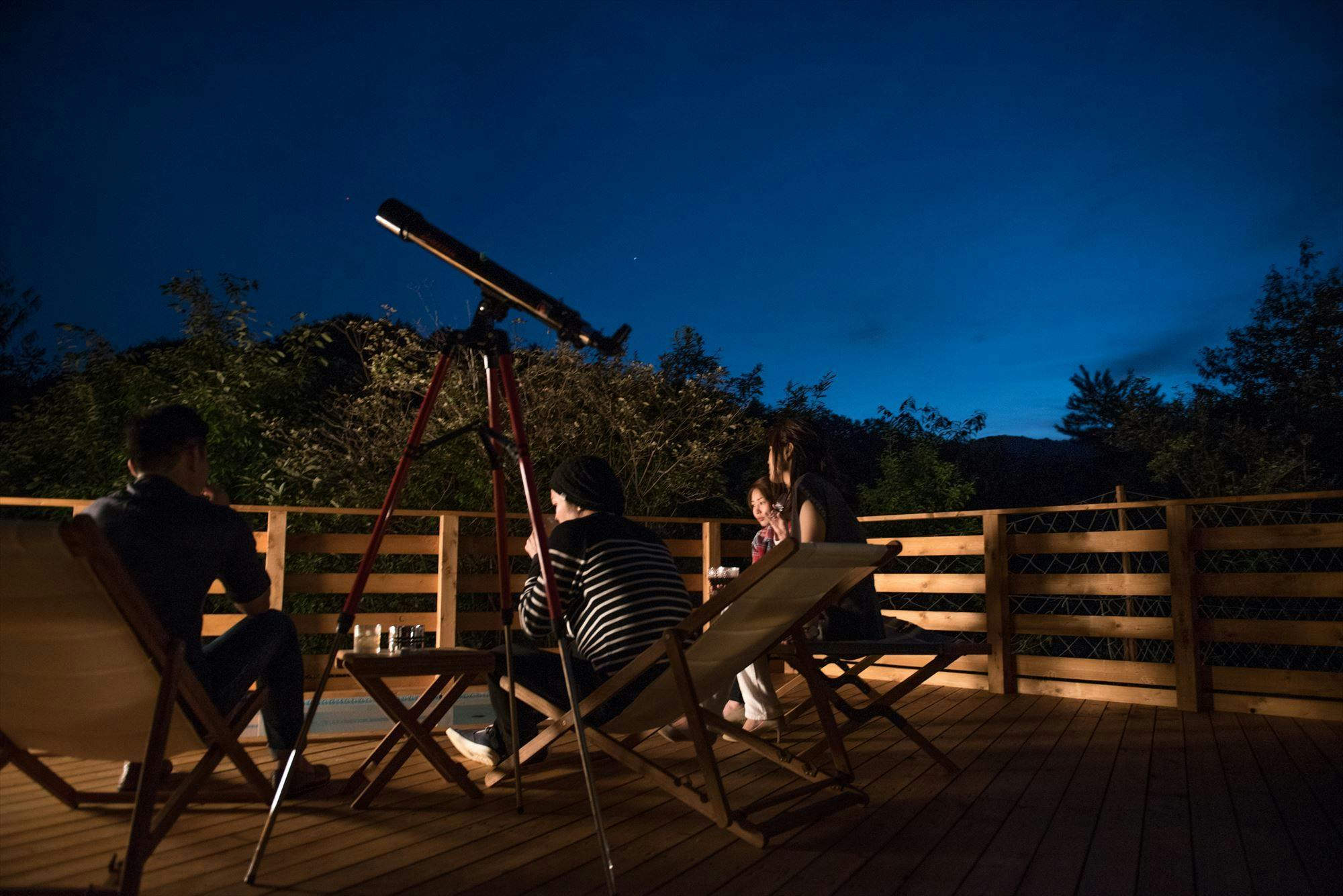 グランピングヴァケーションヴィラの充実の設備に加えて、広いプライベートデッキにアクアガーデンとハンモックを設置。天体望遠鏡もご利用いただけます。