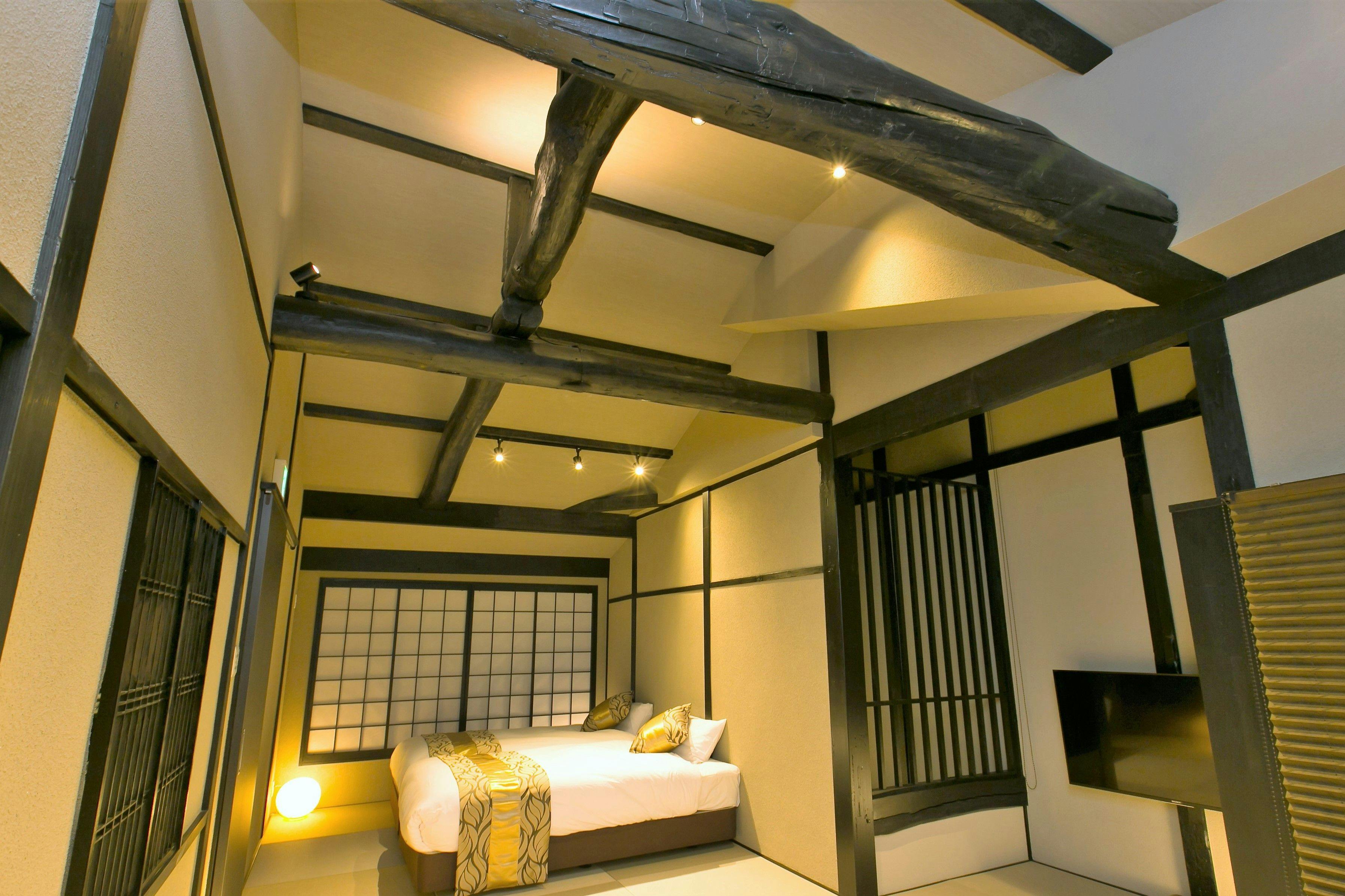 時を重ねた建物だけが纏う独空の気感。古き良き日本建築の趣ある町家。お庭を眺めながらのお風呂には広いジェットバスを、太い梁と高天井が印象的な寝室には世界で愛されるシモンズ社製のベッドをご用意しました。