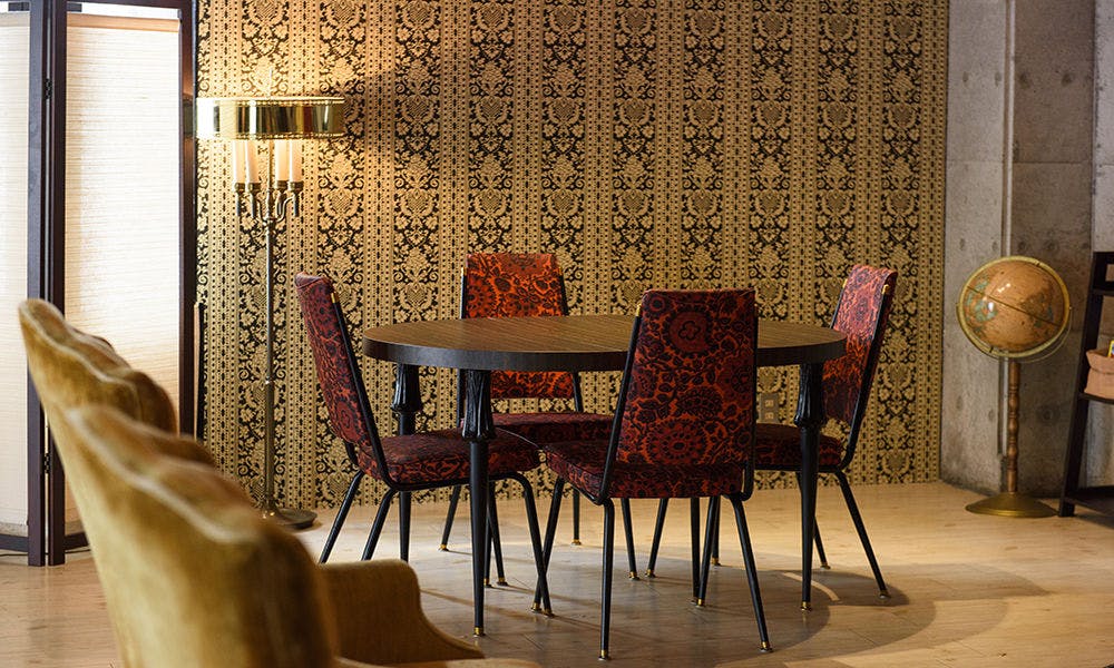 92平米の広々とした空間は「赤」を基調とし、落ち着いた壁紙の色と重厚感あるヴィンテージ家具を揃えました。
