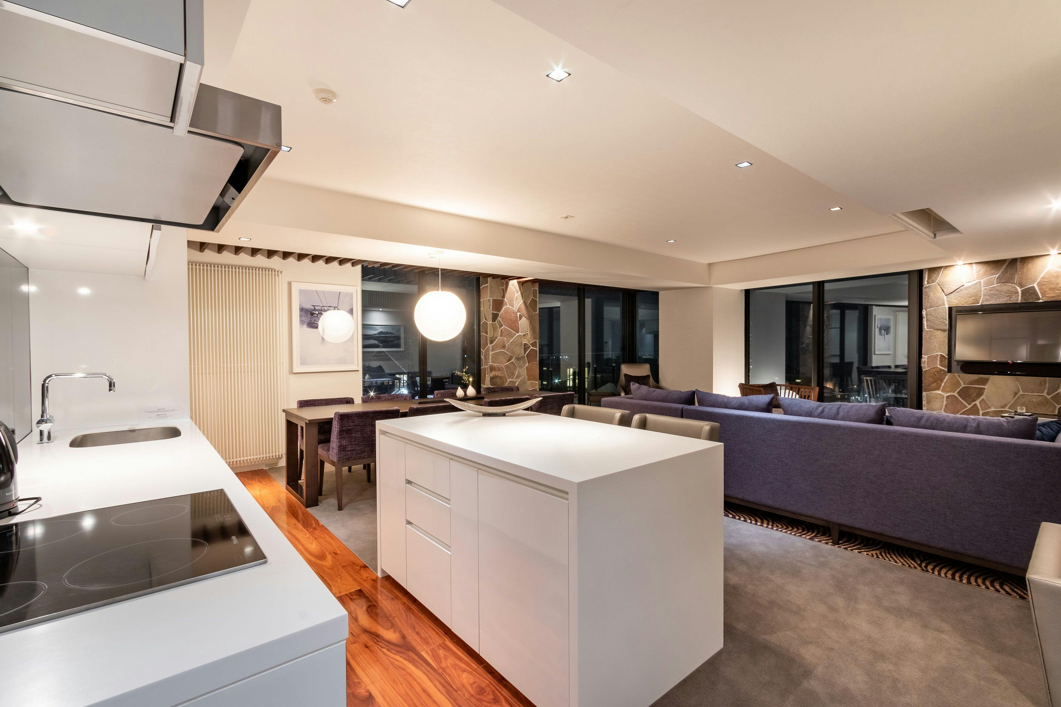 キッチンには、食洗機、オーブン、電子レンジ、IHオーブントップ等あり、ご自身で調理をお楽しみいただけます。リビングルームには40型のフラットTV、バルコニーも付いております。