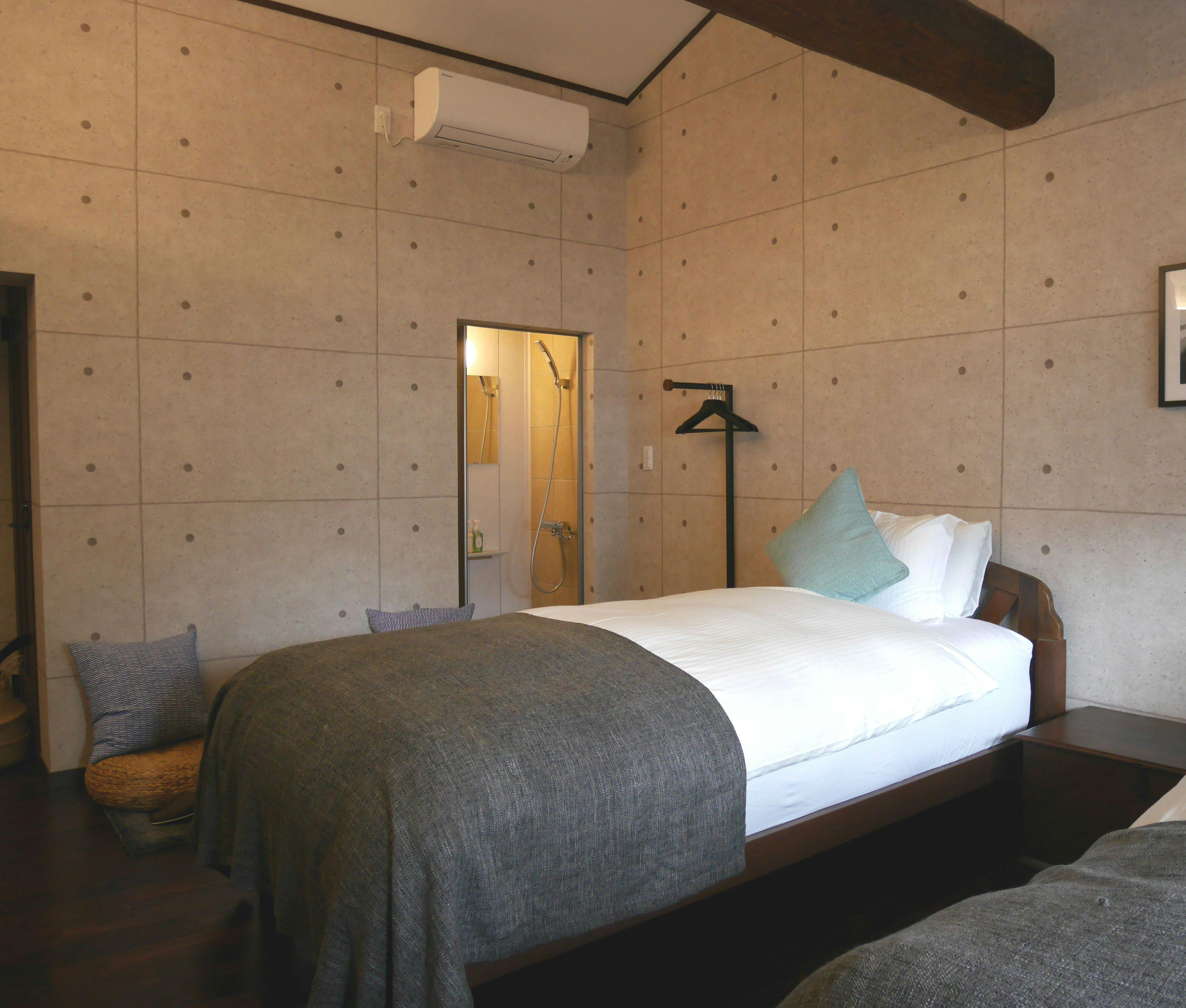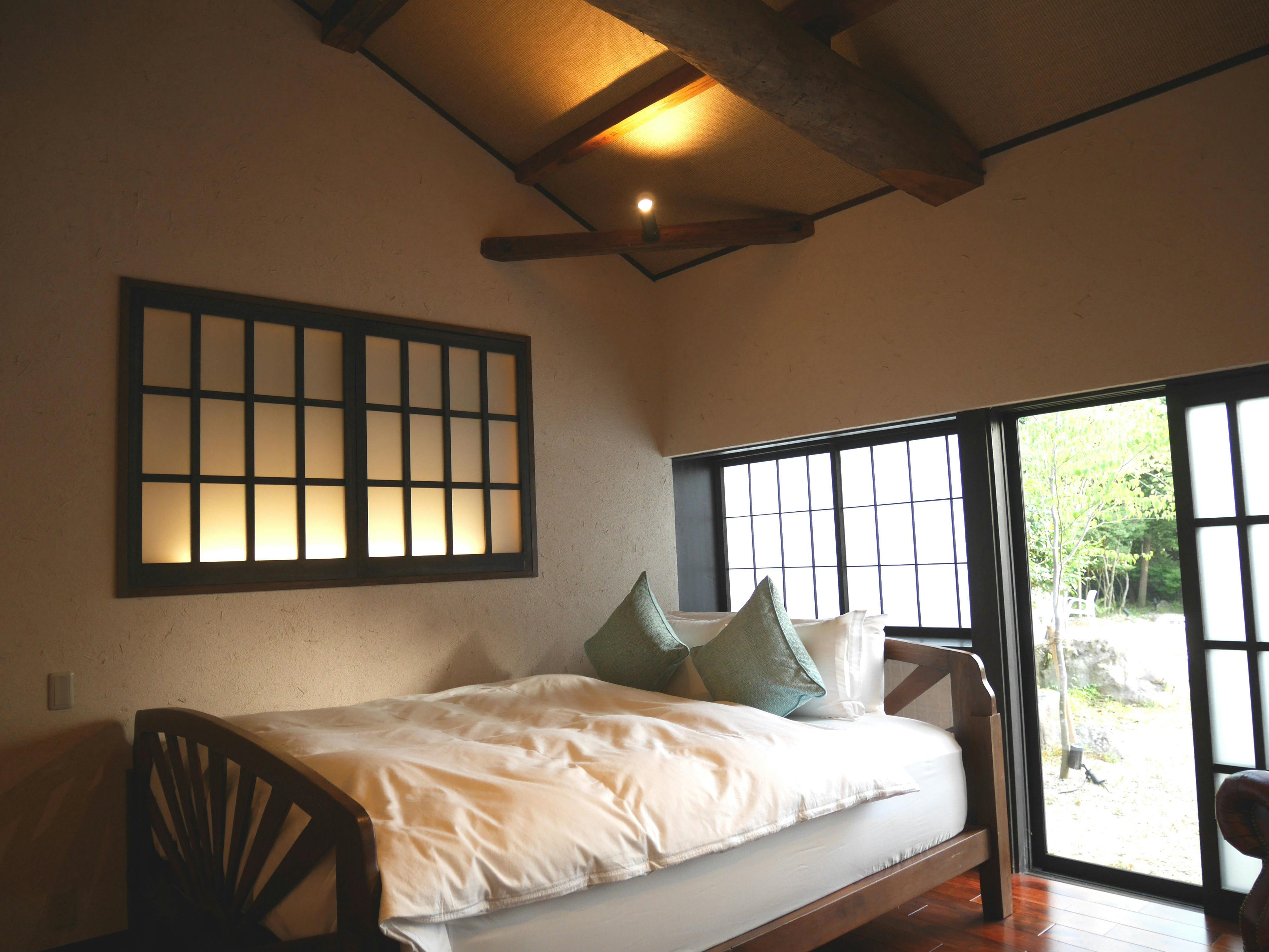 庭に面した特別な離れ(クイーンサイズベッド1台)お部屋で長時間ゆっくりと過ごされたいお客様に向いております。トイレ・洗面・シャワールーム付■設備・アメニティ■wifi無料、バスタオル、シャンプー、コンディショナー、ボディソープ、ナイトウェア、歯ブラシセット、ブラシ、髭剃り、ドライヤー