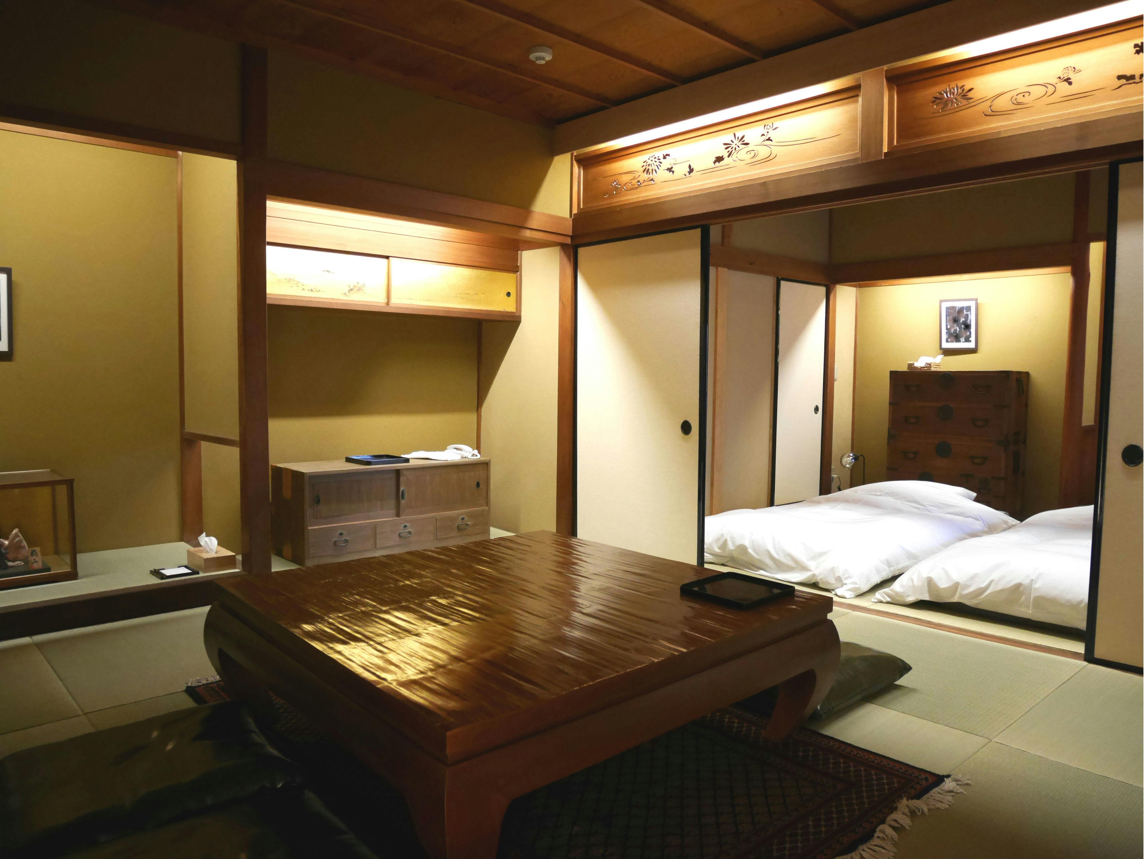 庭を眺める和室のお部屋。寝具は人数に応じてお布団をご用意いたします。トイレ・洗面・シャワールーム付き。■設備・アメニティ■wifi無料、バスタオル、シャンプー、コンディショナー、ボディソープ、ナイトウェア、歯ブラシセット、ブラシ、髭剃り、ドライヤー、お茶セット