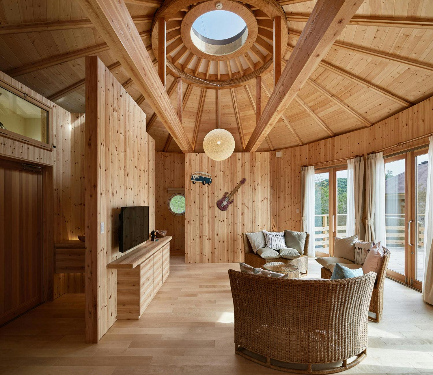 ベットルーム、リビングルームを備え、ゆったりとした客室。木のぬくもりを感じる心地よい空間で寛ぎのひとときをお過ごしいただけます。高さ5m以上の天窓から眺める星空は、天然のプラネタリウム。朝は眩いばかりの朝日が差し込み、島の自然に包み込まれます。ヒノキ風呂を設置し、ヒノキの爽やかな香りに癒されます。