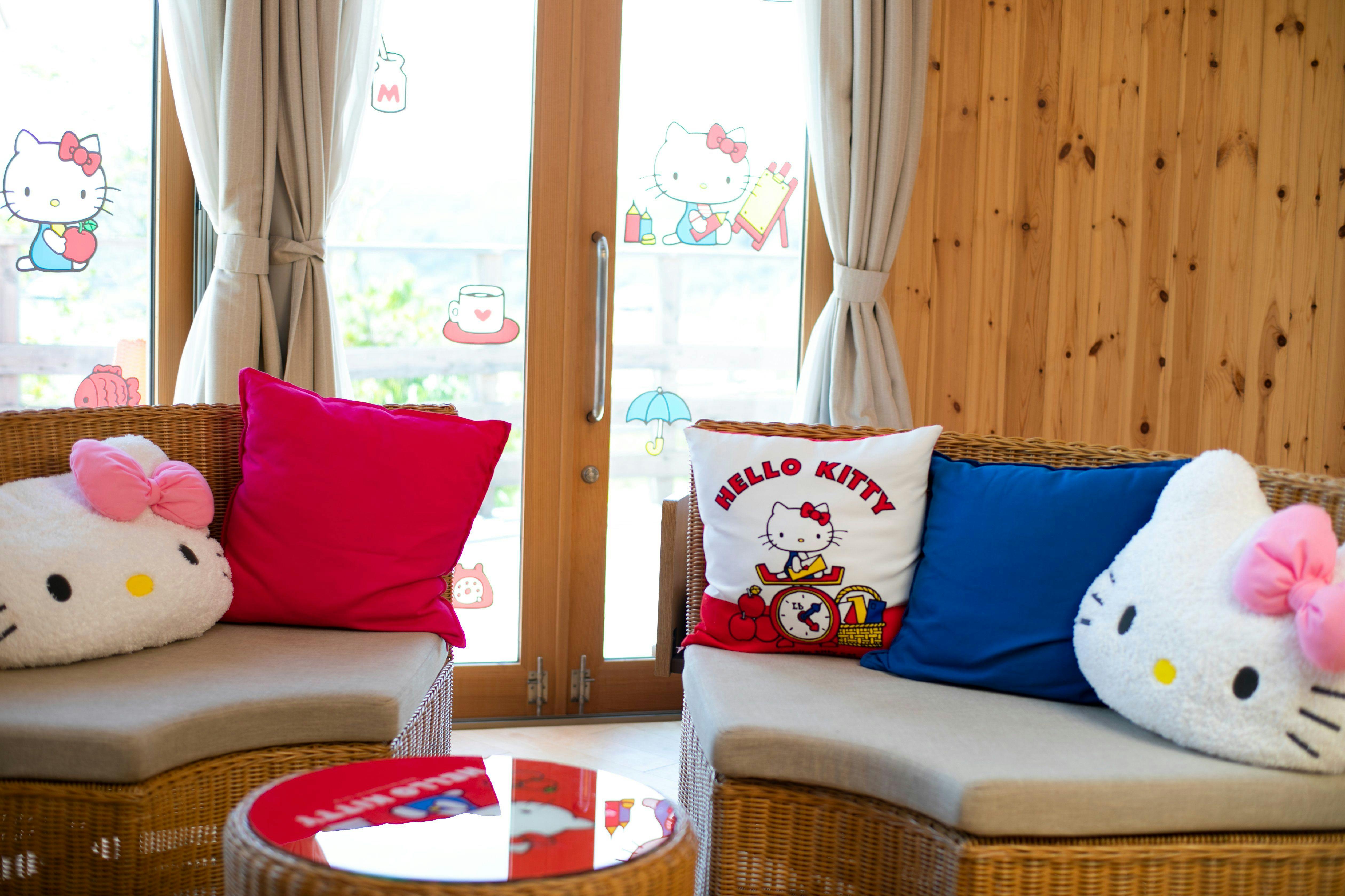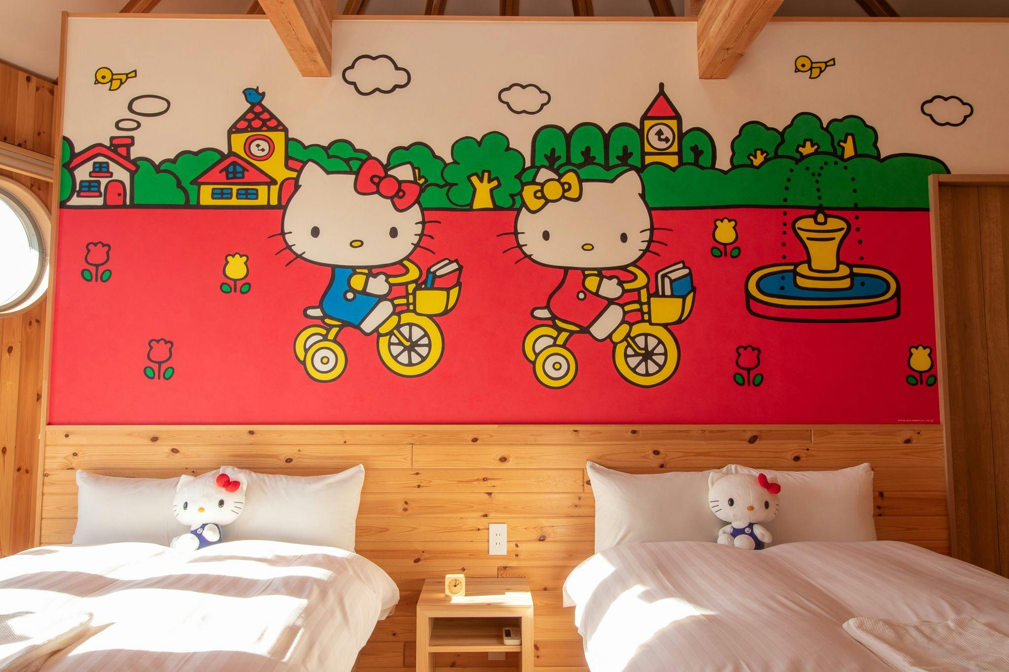 ゆったりとしたツインタイプの客室。1970年代のハローキティをテーマにしたデザインがあしらわれており、当時のハローキティの世界観を存分にお楽しみいただけます。