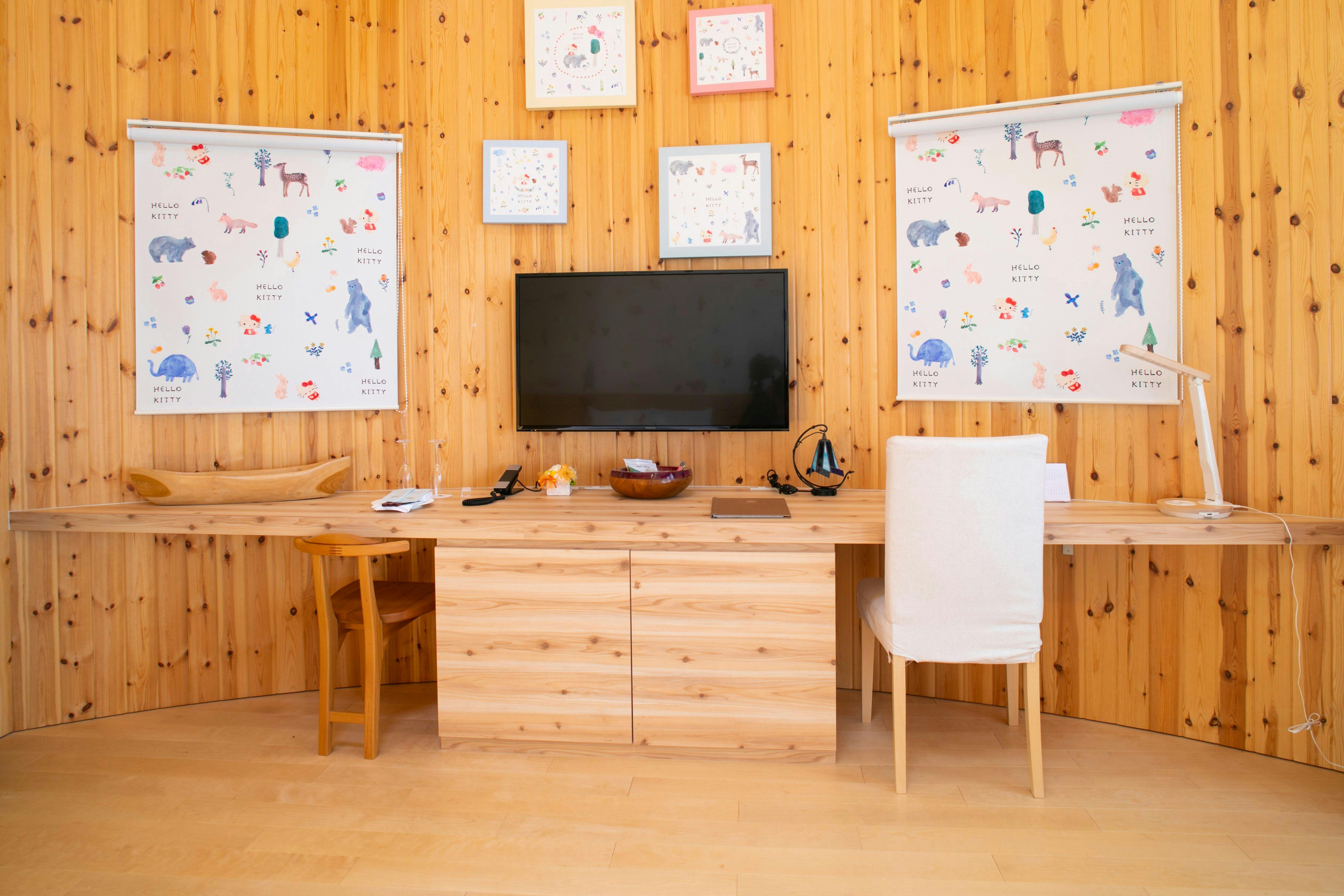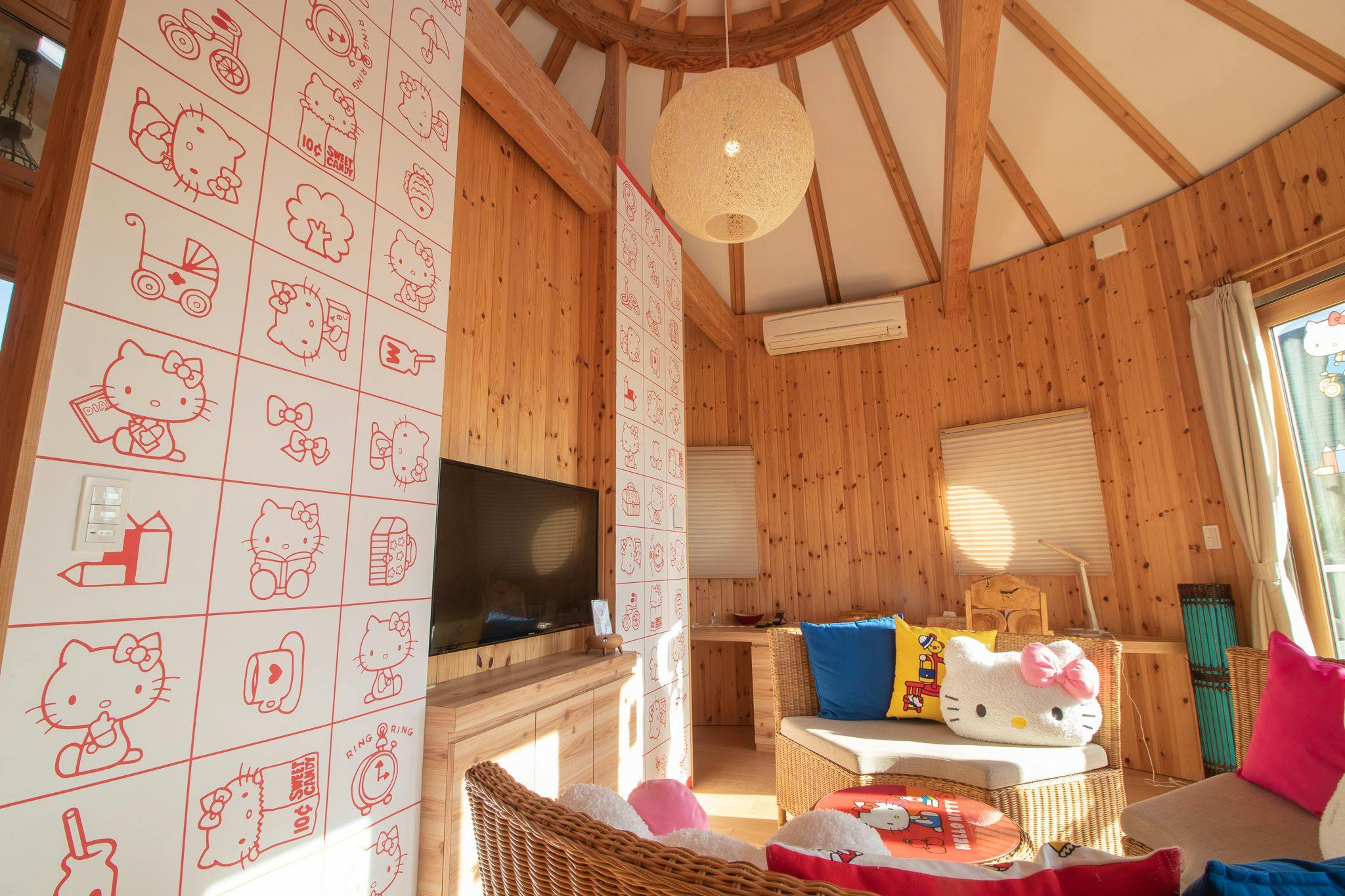 星をテーマにしたハローキティのオリジナルデザインがあしらわれており、天井高が5mを超える客室に設置された天窓から見える星空とあわせてお楽しみいただけます。ベット…シングルベット2台、2段ベット