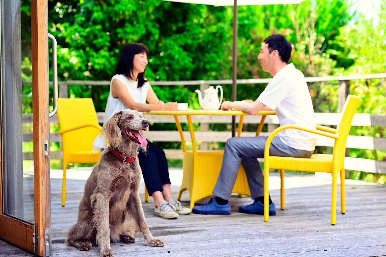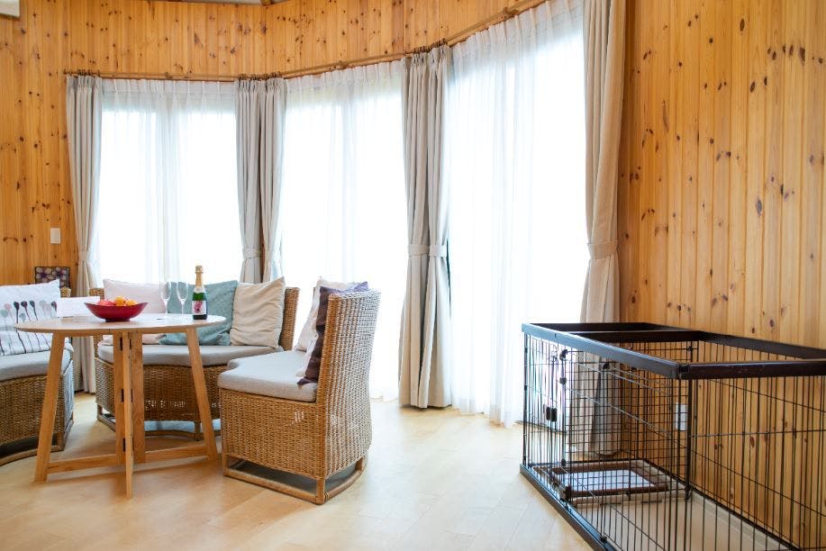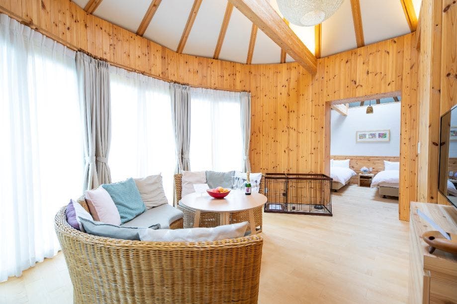 ベットルーム、リビングルームを備えた愛犬と同室で滞在できる客室。愛犬との特別な時間をお過ごしいただけます。高さ5m以上の天窓から眺める星空は、天然のプラネタリウム。朝は眩いばかりの朝日が差し込み、島の自然に包み込まれます。ヒノキ風呂を設置し、ヒノキの爽やかな香りに癒されます。