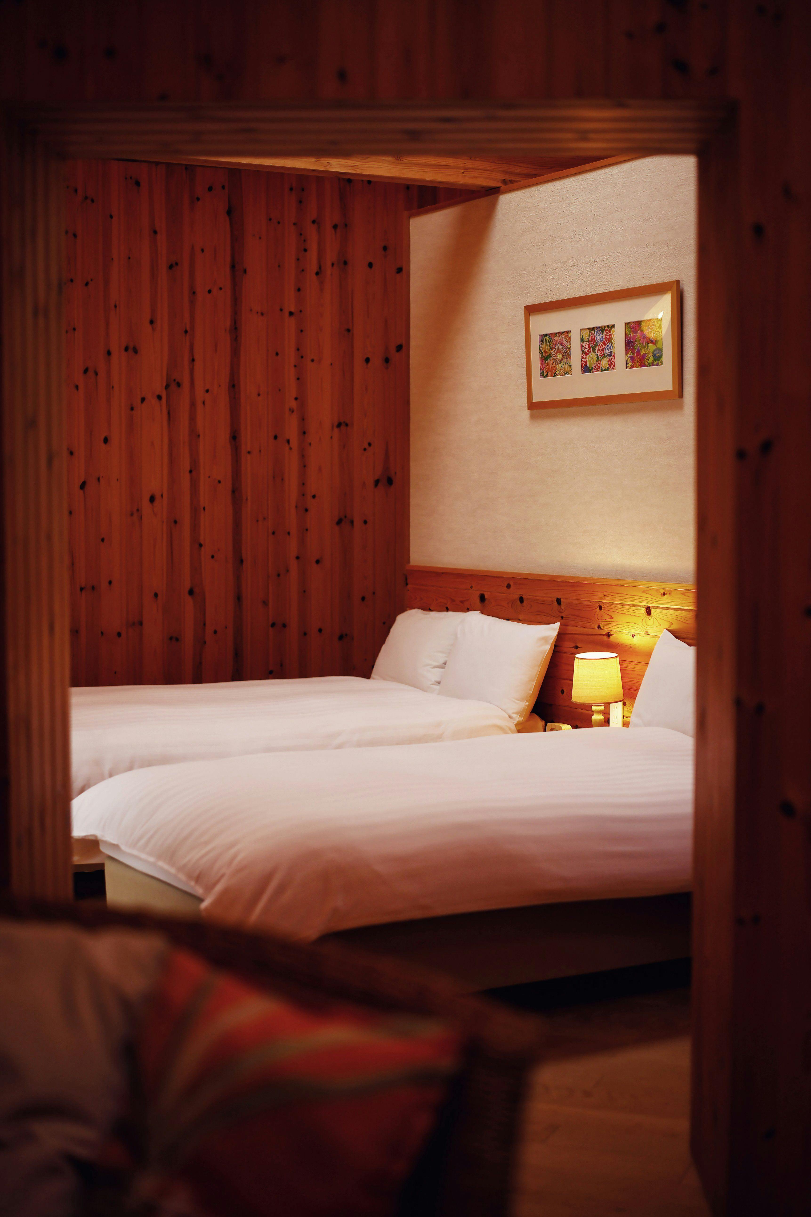 ツインタイプのスタンダードの客室。木のぬくもりを感じる心地よい空間で寛ぎのひとときをお過ごしいただけます。高さ5m以上の天窓から眺める星空は、天然のプラネタリウム。また朝は眩いばかりの朝日が差し込み、島の自然に包み込まれます。ヒノキ風呂を設置し、ヒノキの爽やかな香りに癒されます。