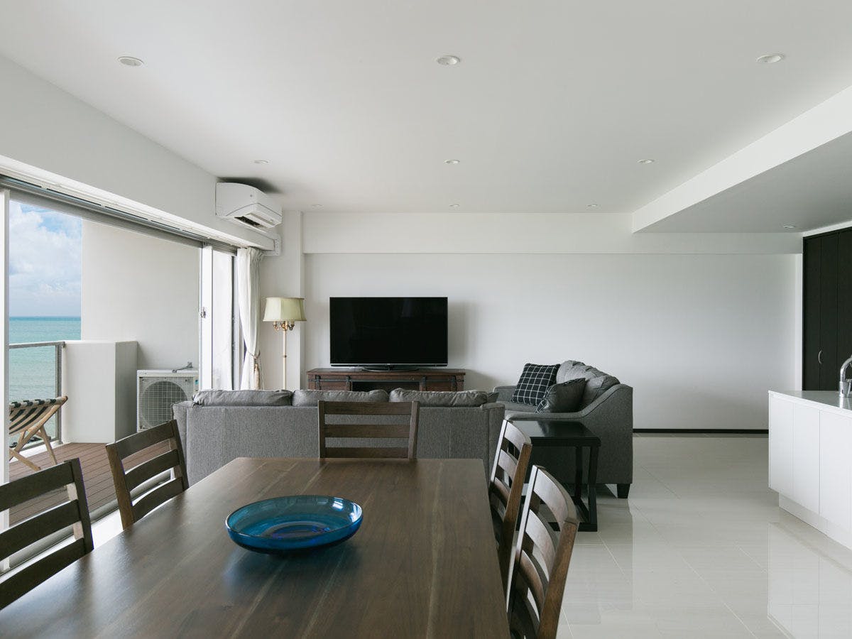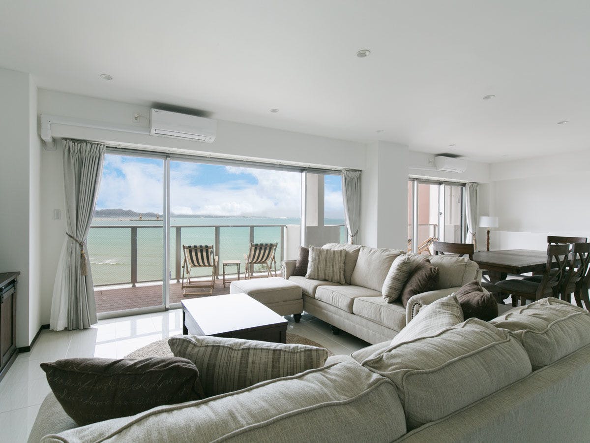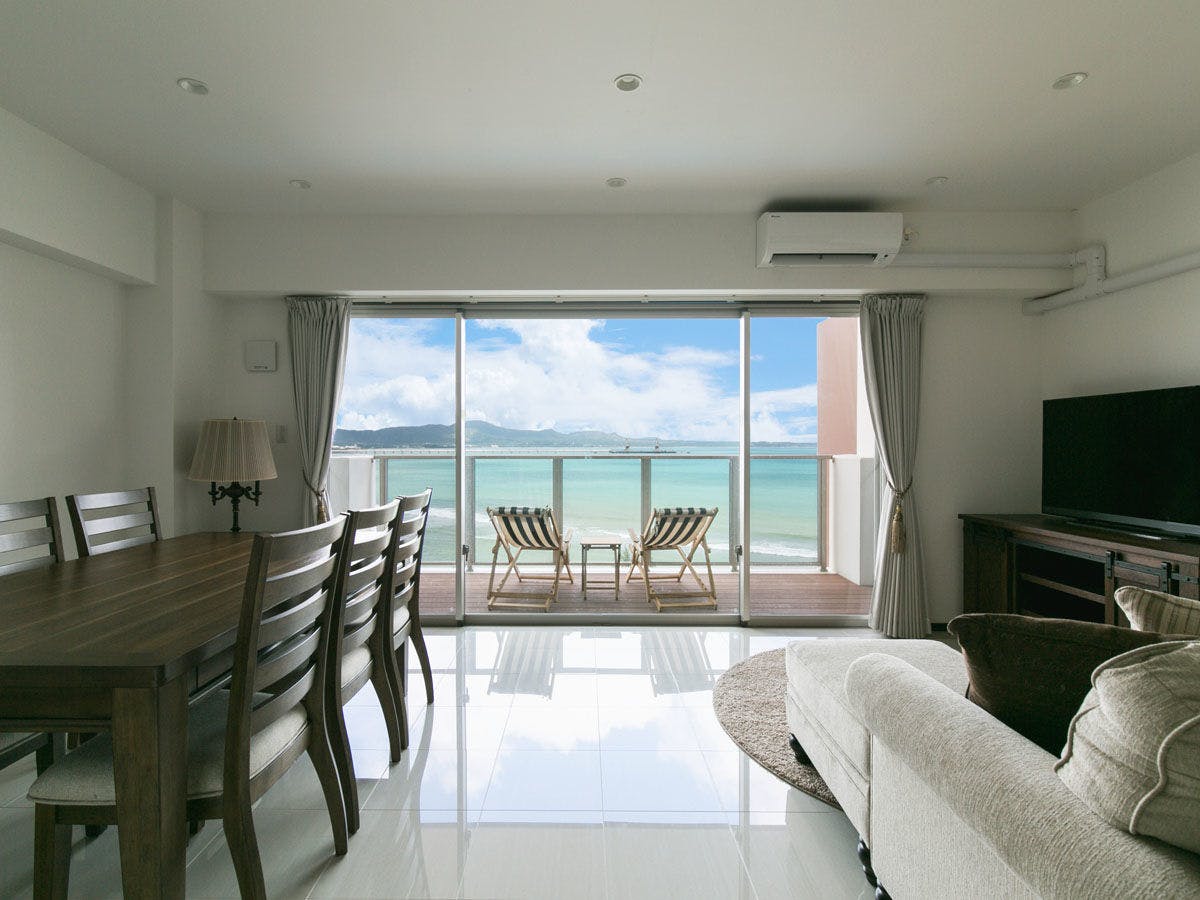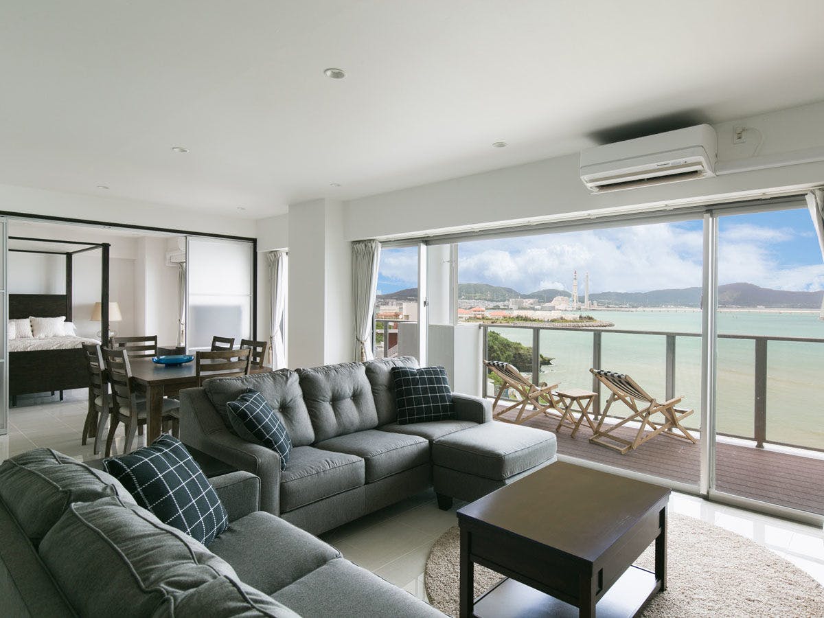 最大12名での滞在が可能な2LDK。4階の角部屋、オーシャンビューです。