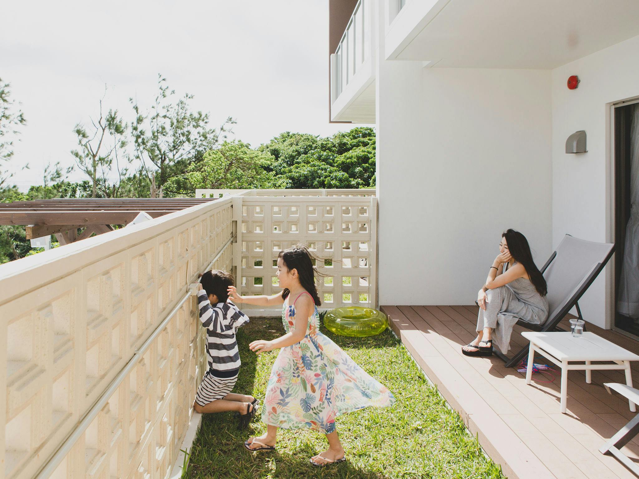 最大6名での滞在が可能な1LDK。誰もが楽しめリラックスできる「公園」をコンセプトにHIDEOUTの庭は造られました。庭の先にはプールがあり開放的な雰囲気。