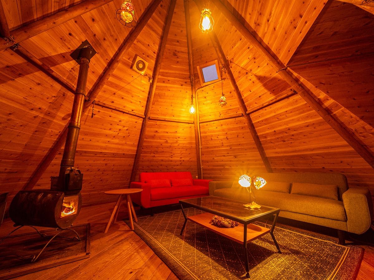 薪ストーブ付きキャビン(36平米)と、隣にティピーテント(27平米)を常設しています。
