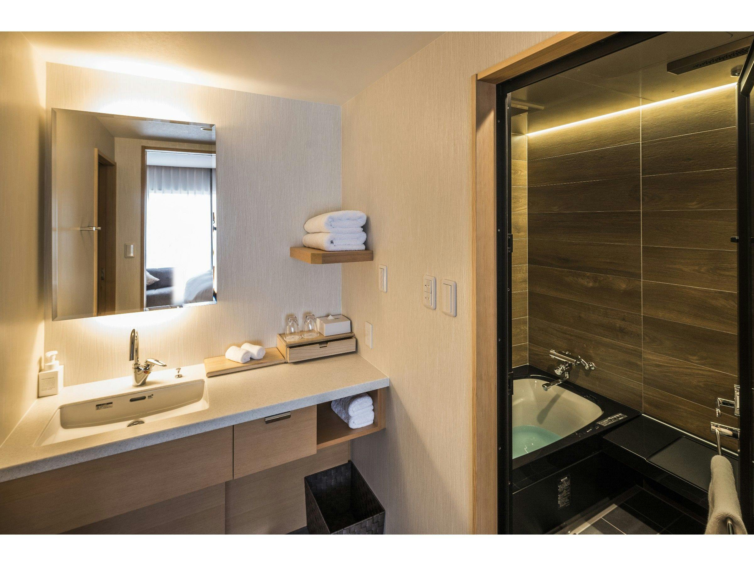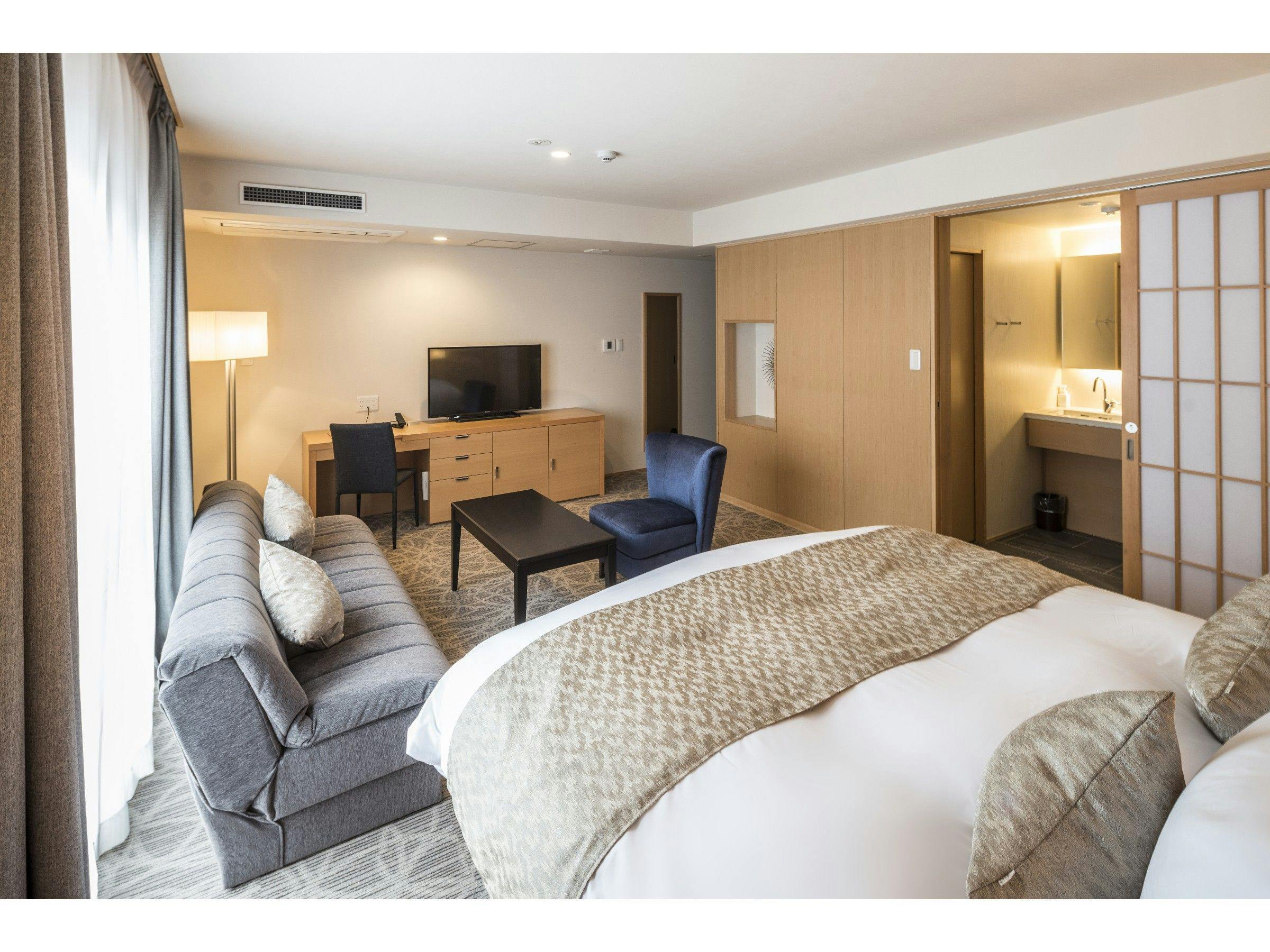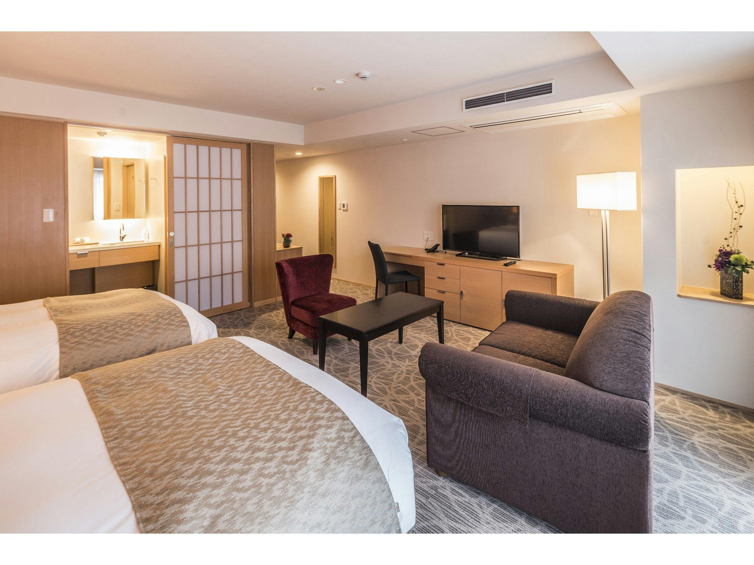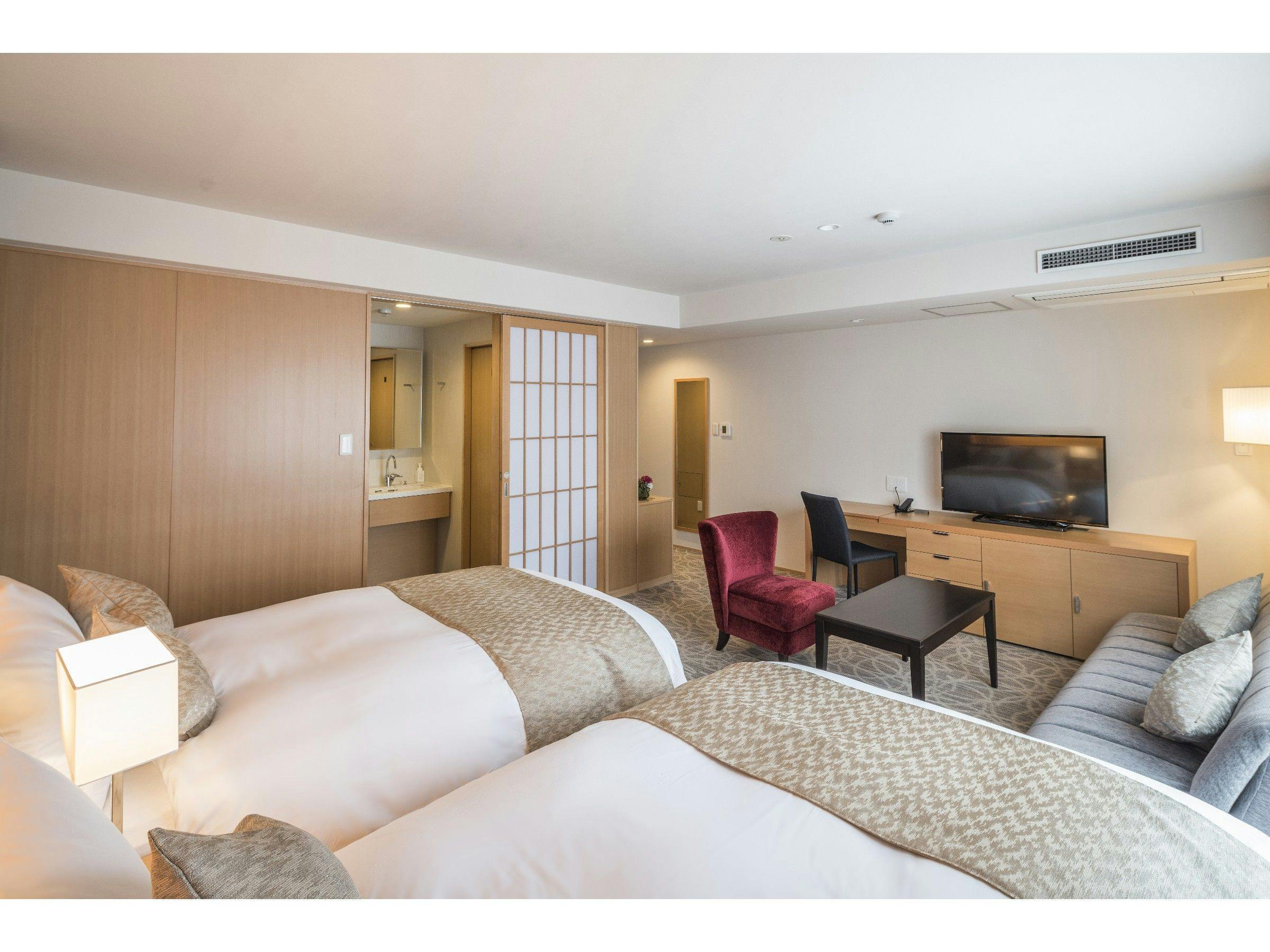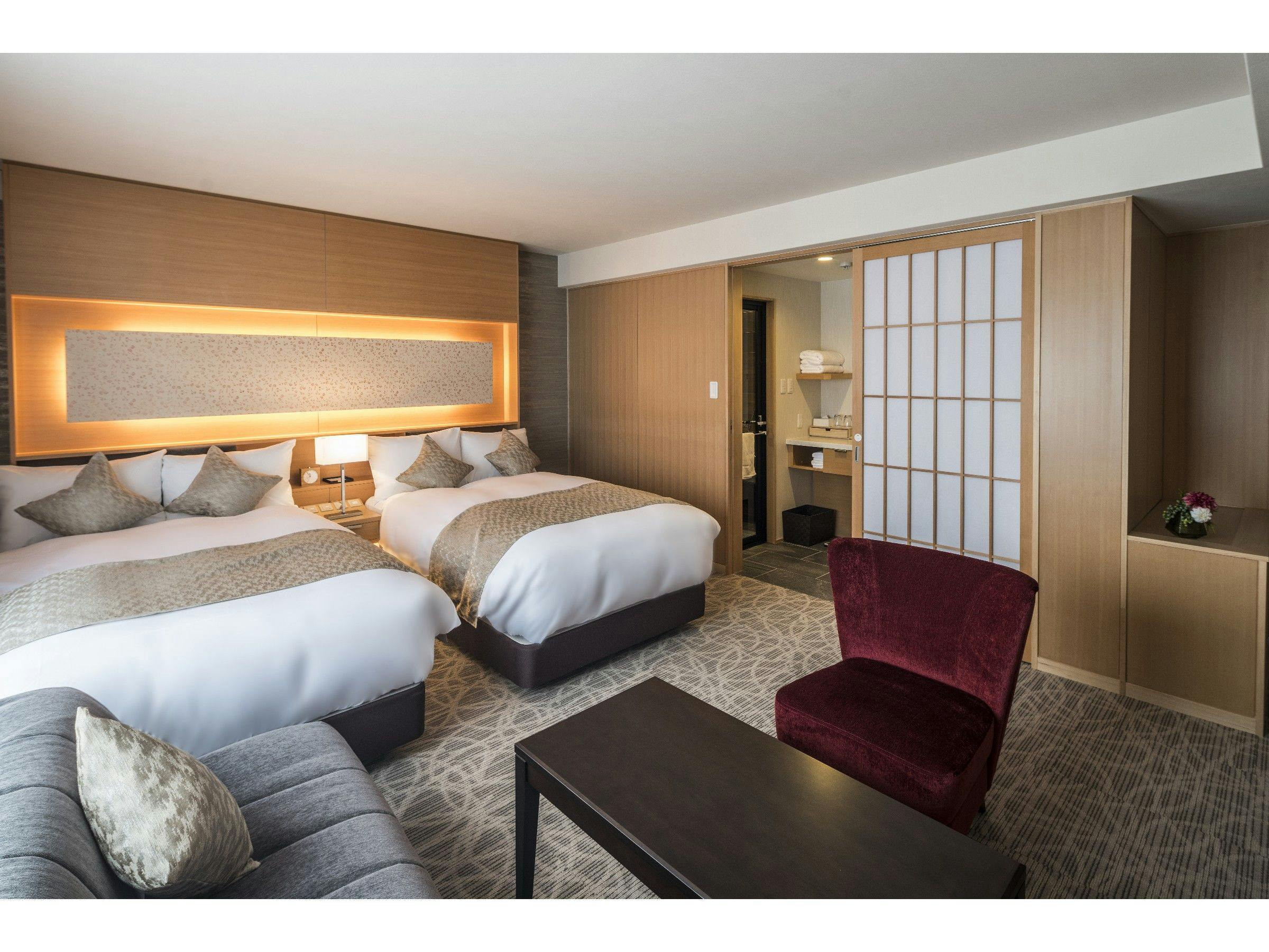 無料インターネット接続(WiFi/有線LAN)、エアコン、薄型テレビ、衛星チャンネル、外国語放送(英語、中国語)、客室内線電話、アラームクロック、ヘアドライヤー、電気ポット/ケトル、冷蔵庫、ミネラルウォーター(無料)、デスク、ソファ(一部客室)、ソファベッド(一部客室)、遮光カーテン、ワードローブ/クローゼット、シャワー(レインシャワー、打たせ湯)、バスタブ(ジェットバス 一部客室)、ウォシュレットトイレ、鏡、タオル類、バスアメニティー類、ナイトウェア、トイレットペーパー、リネン類、ティッシュペーパー、ドリップコーヒー、煎茶・焙茶(ティーバッグ)、紅茶(ティーバッグ)、セーフティボックス、スリッパ、靴磨きセット、靴べら、消臭スプレー、傘、洋服ブラシ、バスローブ、ヘルスメーター、アクセサリートレー