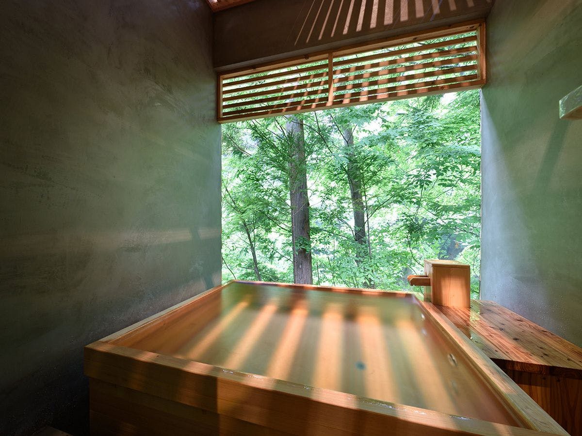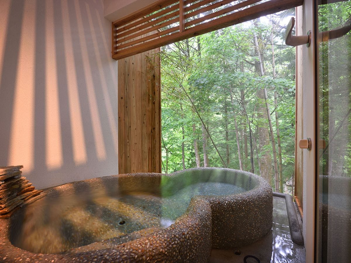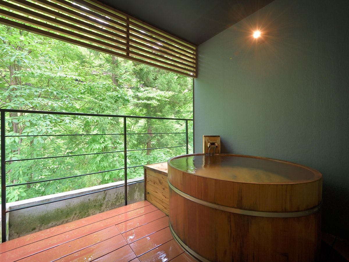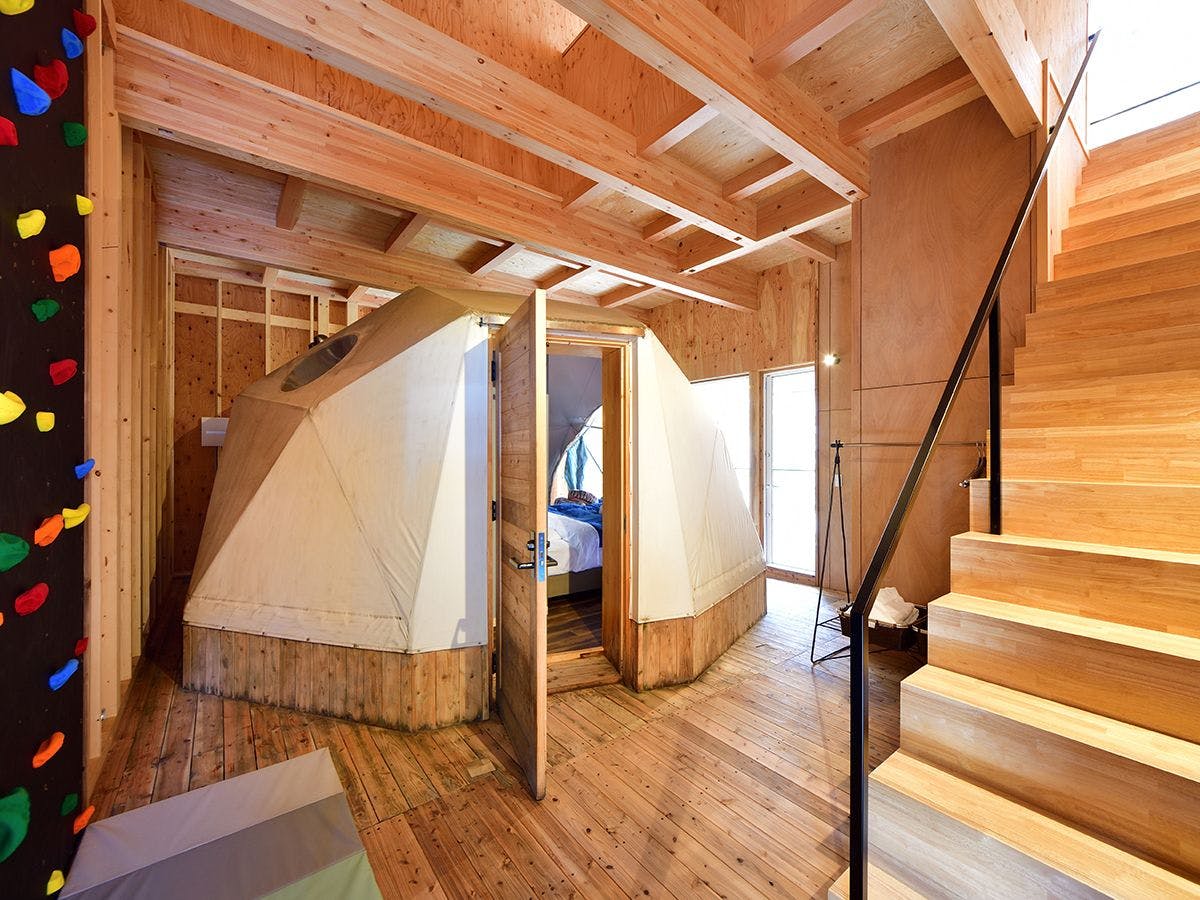 2019年4月、グランピングテントを覆うように2階建の客室にリニューアルしました。四万川の流れる楓仙峡に面したウッドテラスには、プライベートにバーベキューを楽しめる焼台。解放的な桧の露天風呂には暖かな温泉の湯。森に向けた大きな窓とたくさんの星見窓を持つ客室では、ベッドに寝転びながら夜空を眺められます。