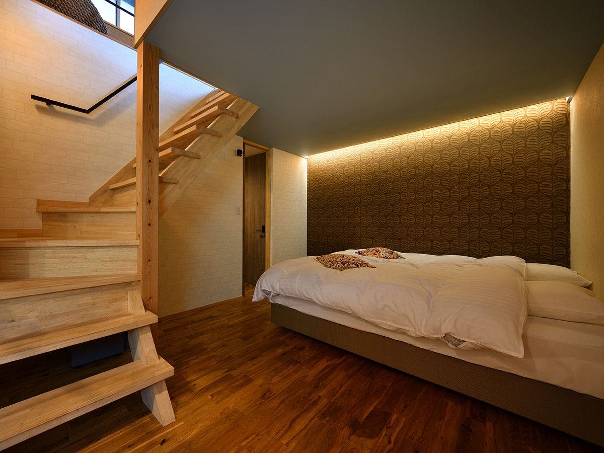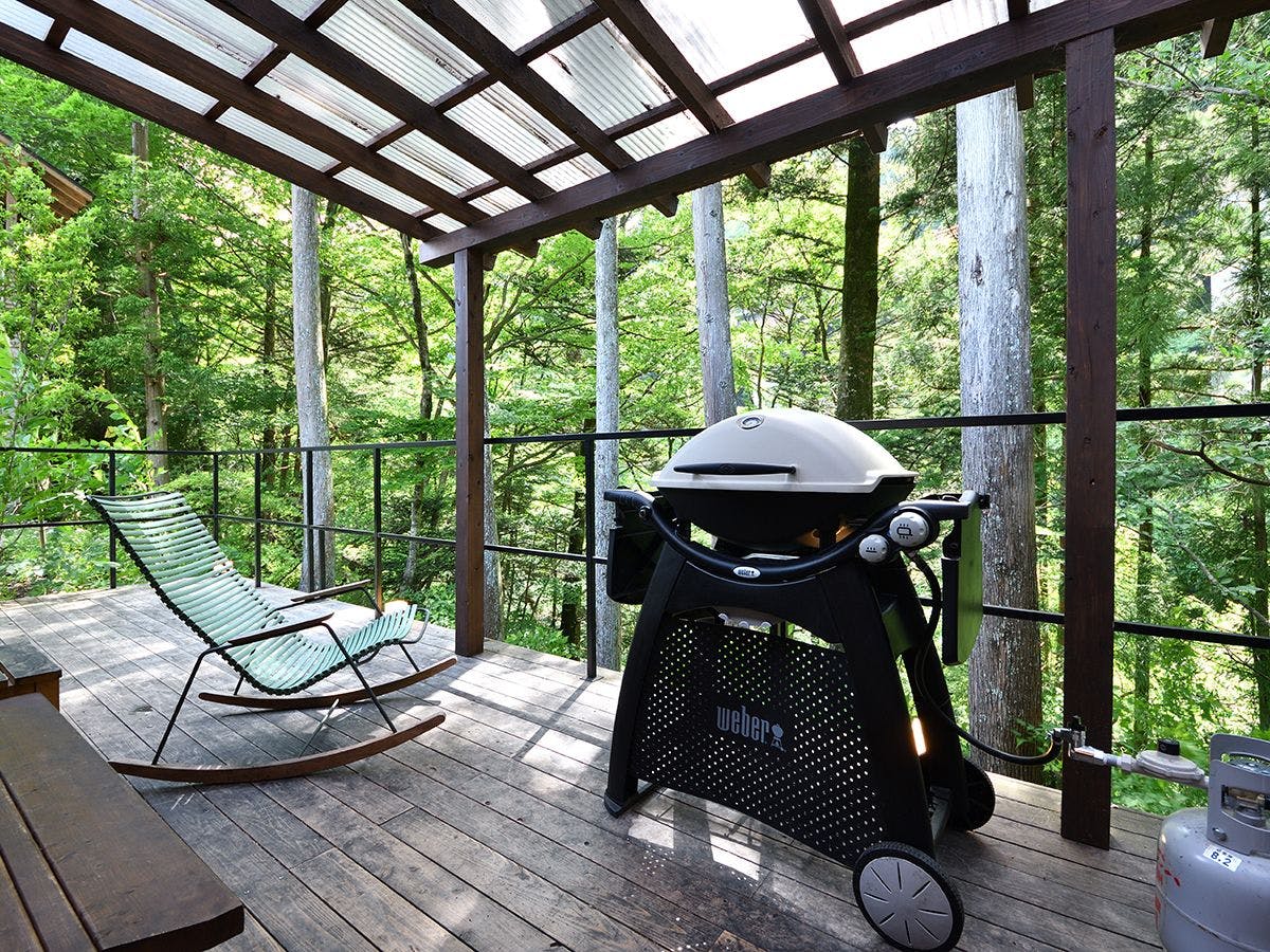 温泉露天風呂+ベッドルーム(ワイドキング1台)+ウッドテラス(ロッキングチェア・BBQ焼台付)