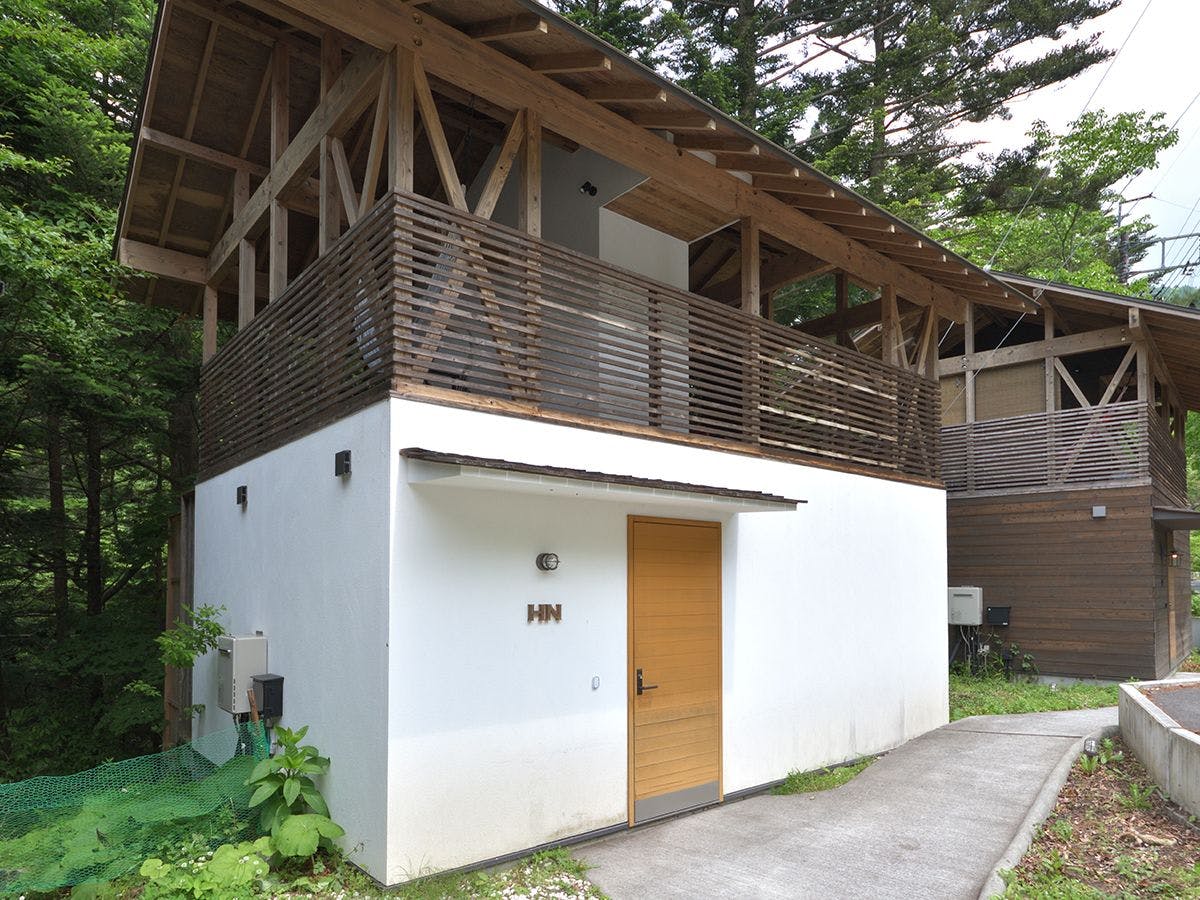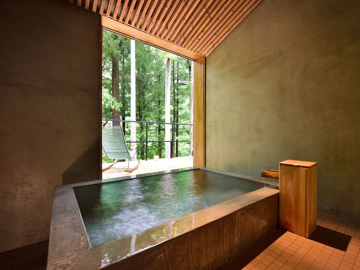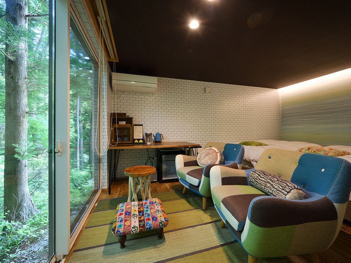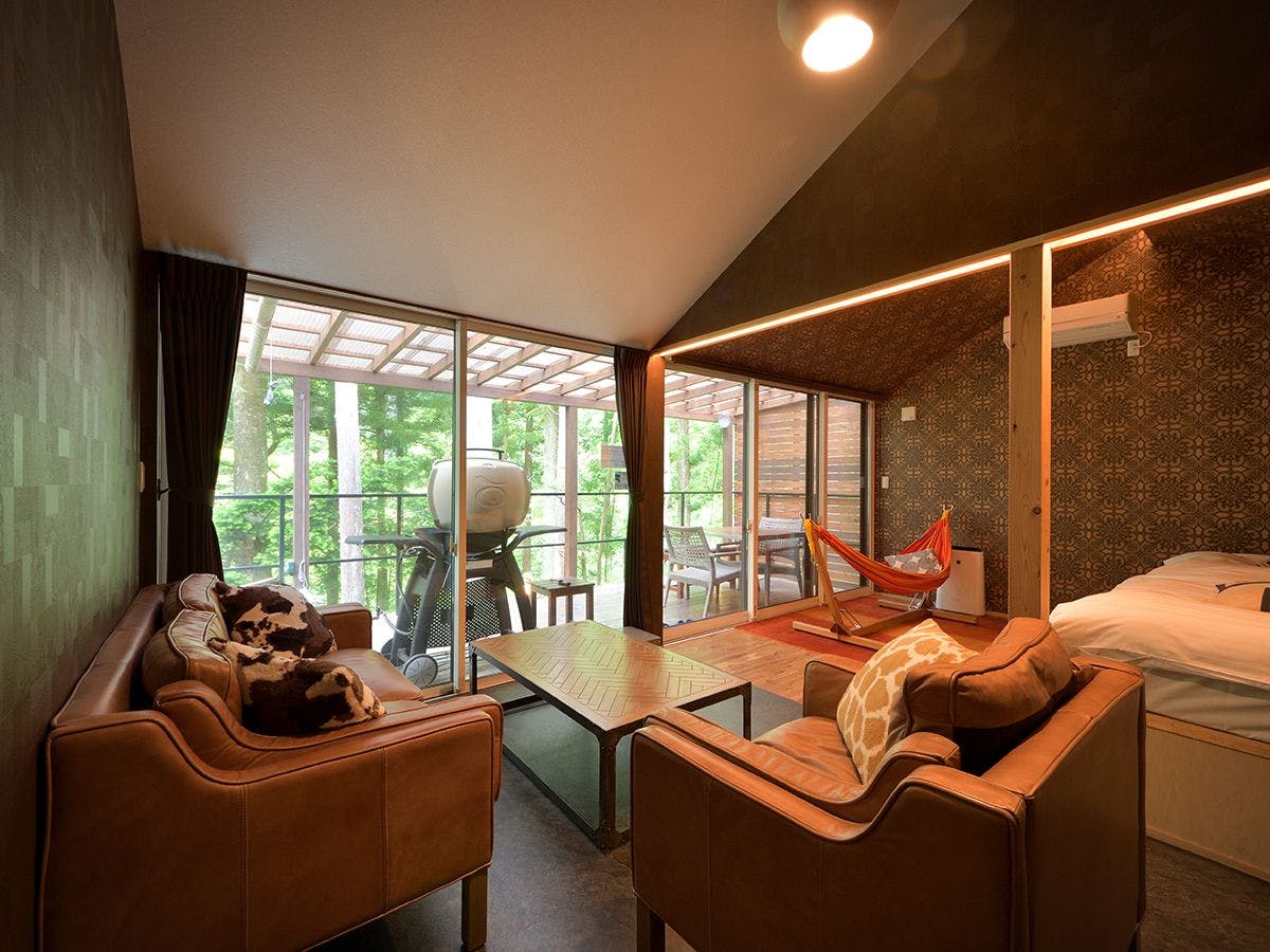 キャビンのテーマは「大自然の癒し」。一階には四万川の流れる楓仙峡に面した解放的な露天風呂と、グリーンを貴重にした色調と意匠を持たせたベッドルーム。プライベートバーベキューを楽しんでいただける二階テラスには、爽やかな風とともに読書や昼寝を楽しんでいただけるハンモックも備えています。