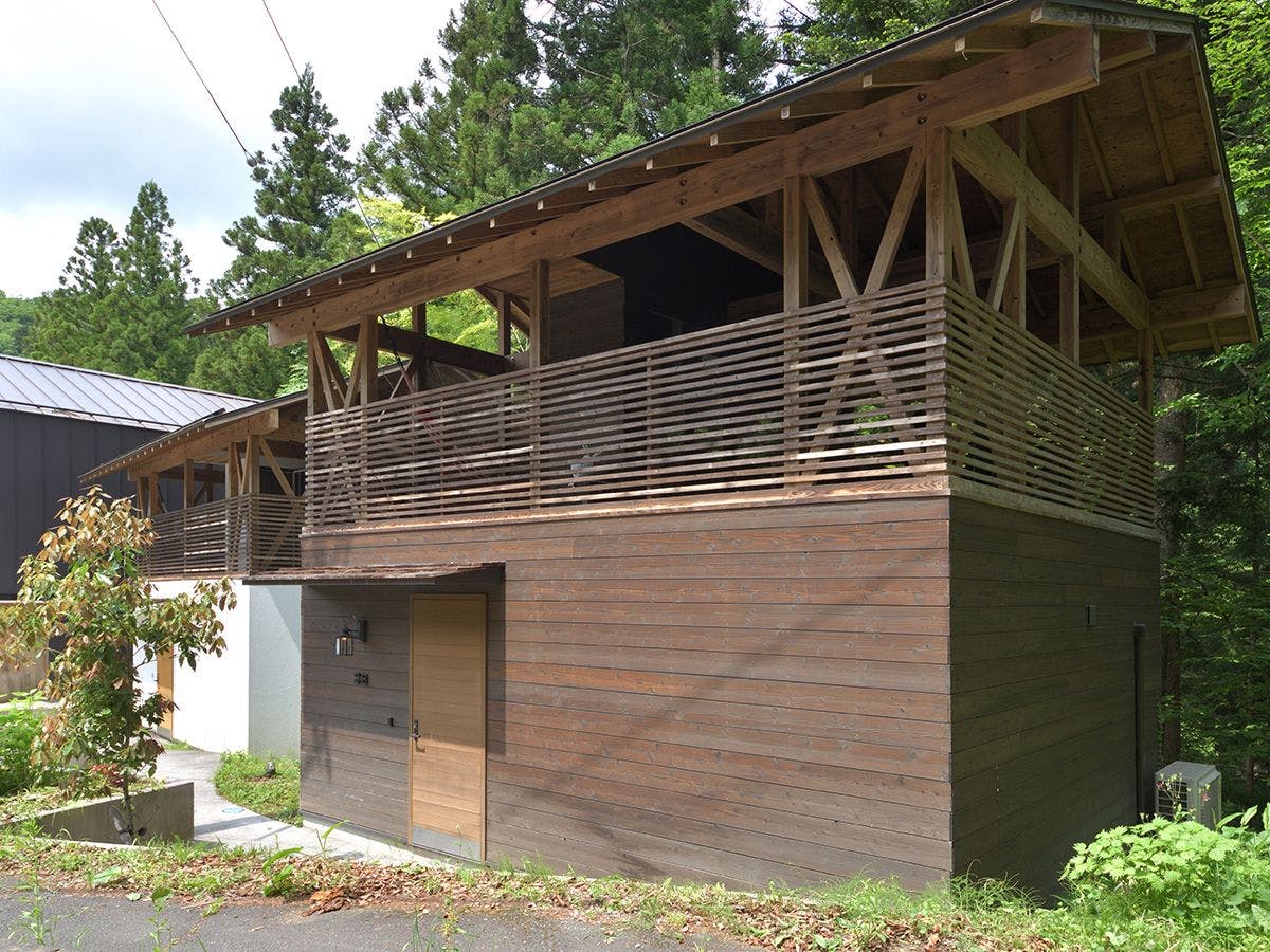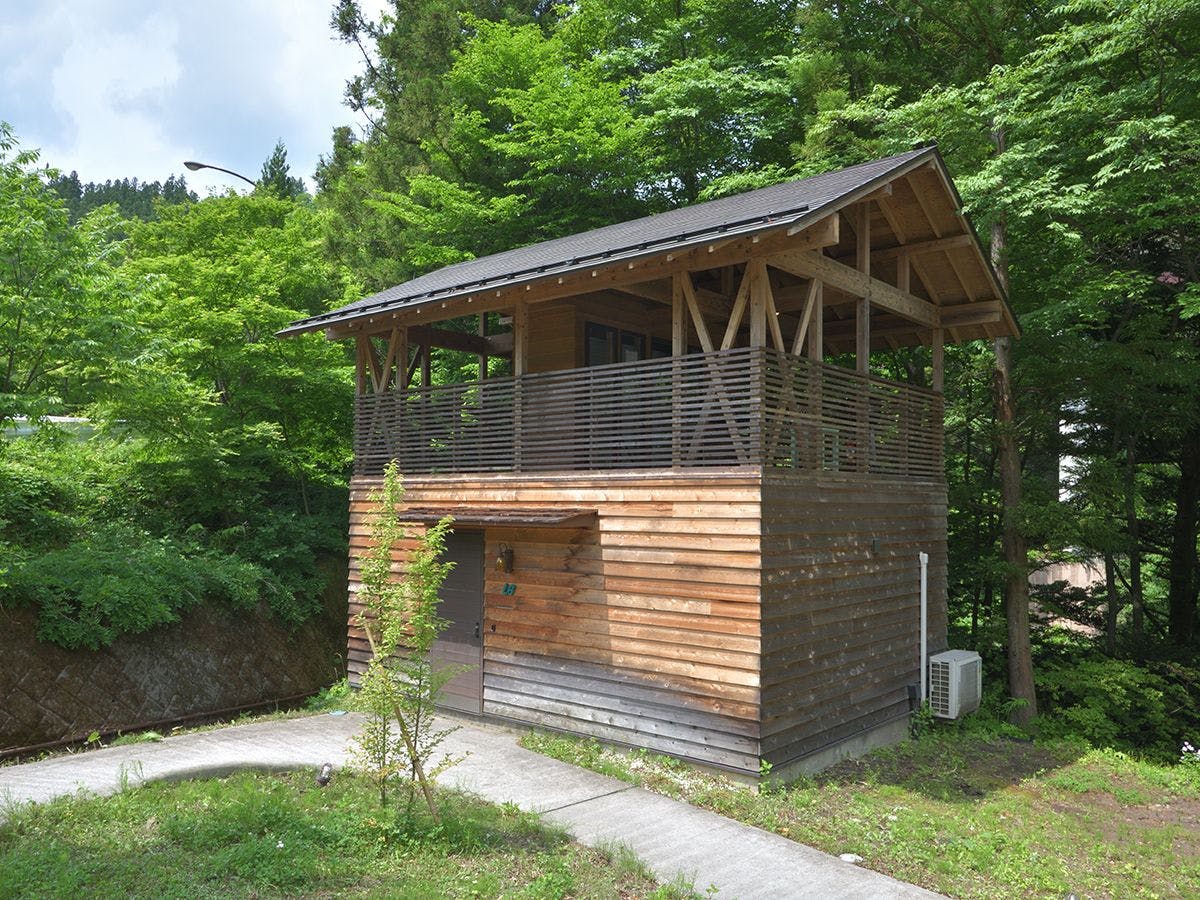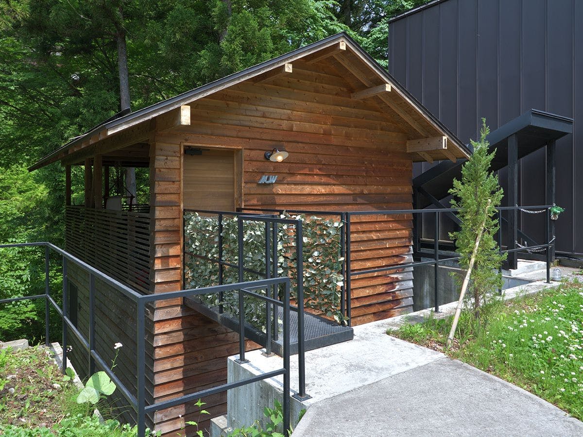 キャビンのテーマは「男の書斎」。一階には四万川の流れる楓仙峡に面した解放的な温泉露天風呂と、落ち着いた色調と意匠を持たせたベッドルーム。プライベートバーベキューを楽しんでいただける二階テラスには、爽やかな風とともに読書や昼寝を楽しんでいただけるハンモックも備えています。