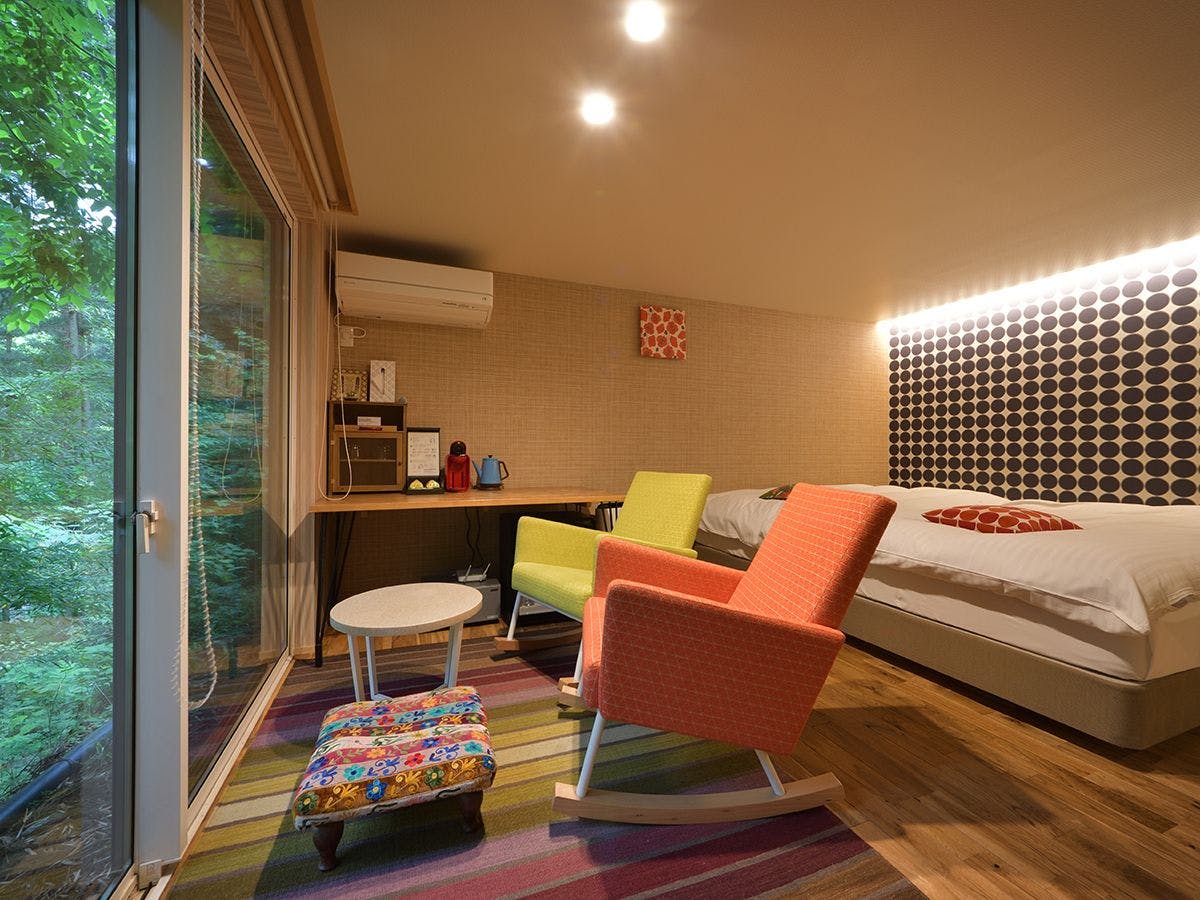 大きなガラス窓を持つキャビンのテーマは「優雅な大人の休日」。広々としたオープンテラスには、プライベートバーベキューを楽しむ焼き台と、ロッキングチェアを備えています。落ち着いた色調のベッドルームには、ゆったり寛げるハンギングチェア。広い露天風呂からは、四万川の流れる楓仙峡を眺めていただけます。