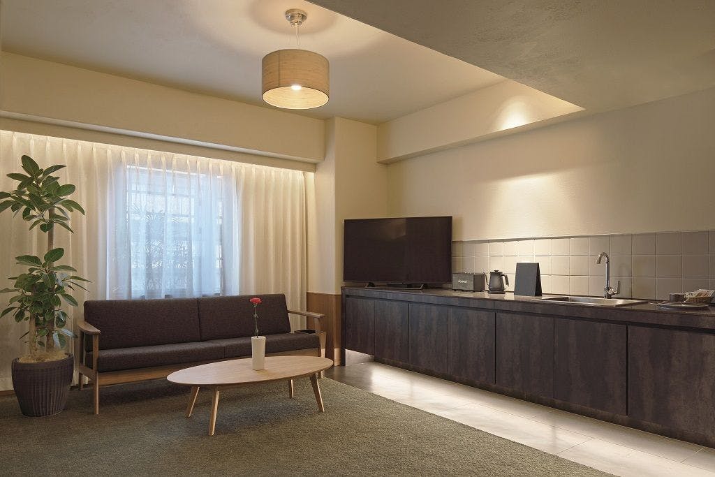ゆったり60平米のお部屋に、140センチのベッドを2台。ミニキッチンに加えてテーブルと椅子をご用意。長期の滞在にも最適です。お部屋には「ととのう」ミストサウナを完備しており、お好みのスタイルで充実した時間をお過ごし頂けます。