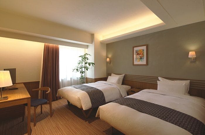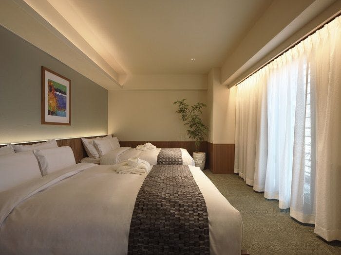 ゆったり27平米のお部屋に、120センチの寝具が2つ。広々とした空間は開放感があり、お二人でのご利用はもちろん、お一人でのご利用など様々な過ごし方でゆっくりとお寛ぎ頂けます。