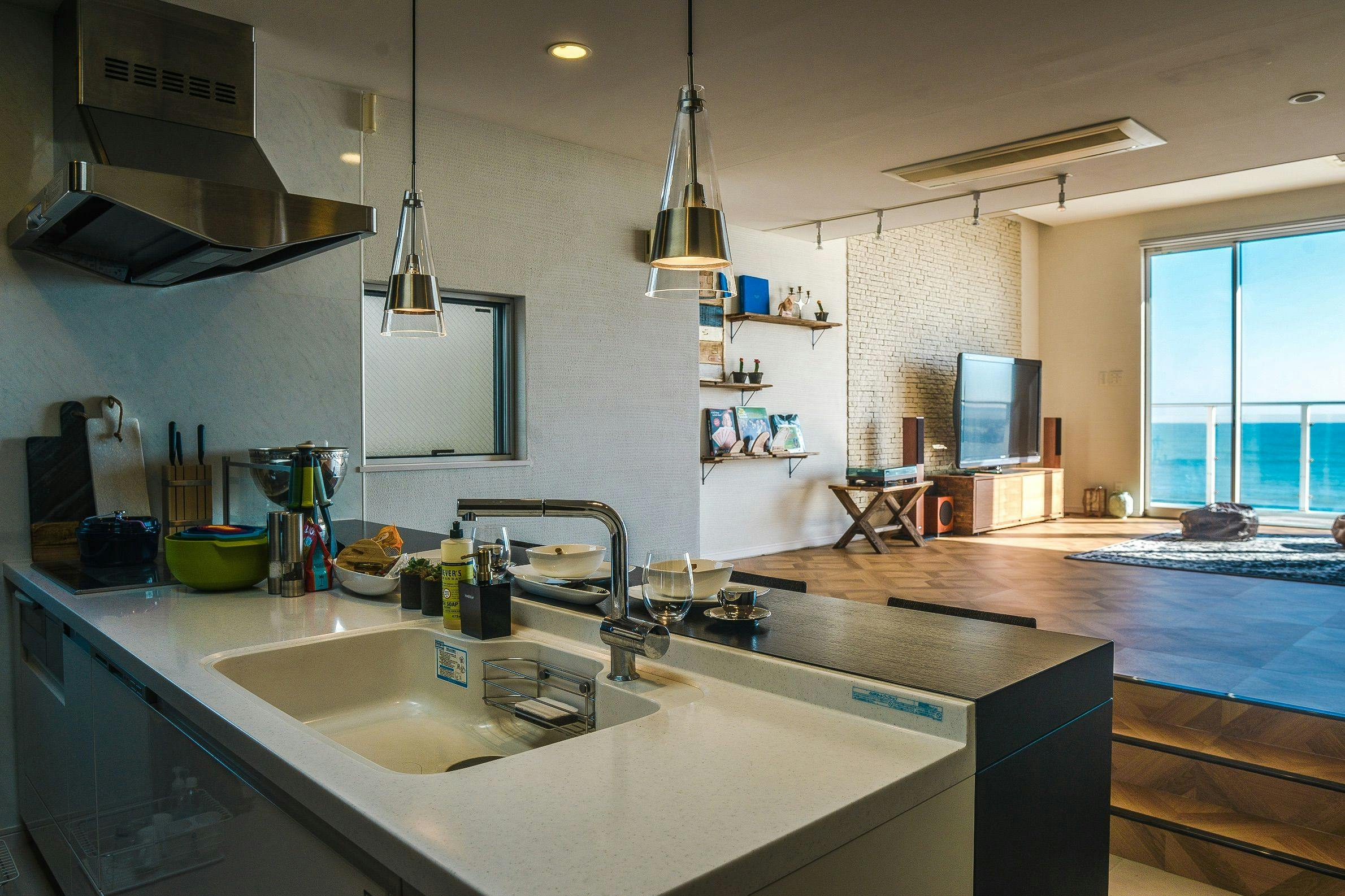 45平米を超えるリビングダイニングキッチンはどこにいても海が見えます。キッチンでぜひ海を見ながら料理やお酒を楽しんでくださいませ。