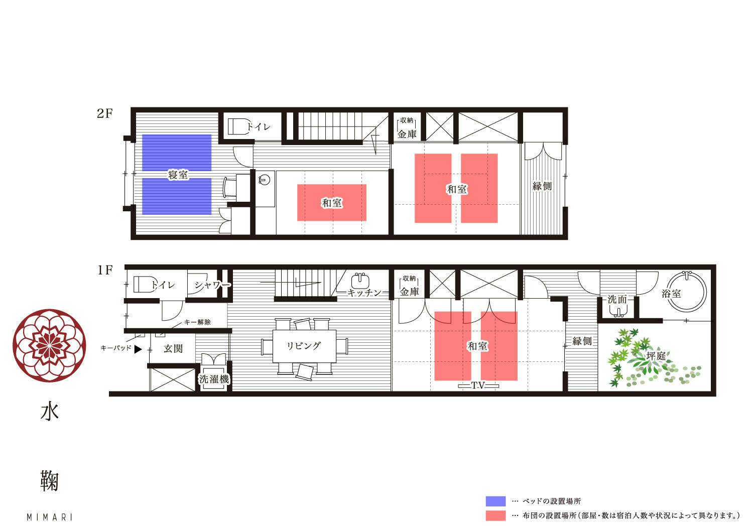 1階:リビング、和室、テレビ、キッチン、浴室、シャワー室、洗面、トイレ、坪庭