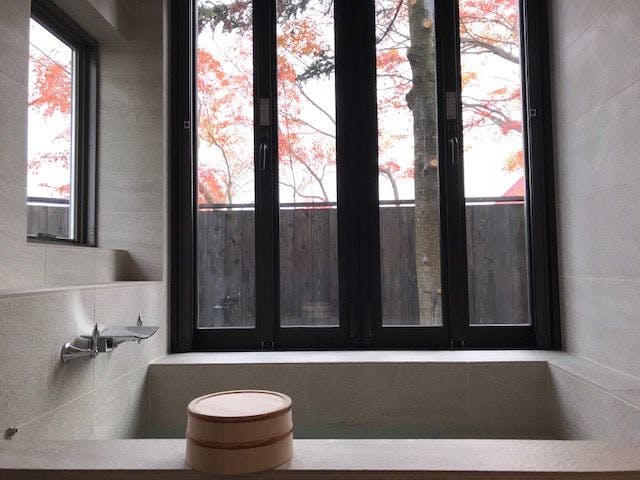 蔵一棟を改装し、寝室としました。畳の上にベッドを置いた和風ベッドルームです。渡り廊下で続く浴室も含め、室内は全て畳敷き。窓を開放すれば、半露天風呂気分も味わえ、檜の香りが漂うお風呂付です。