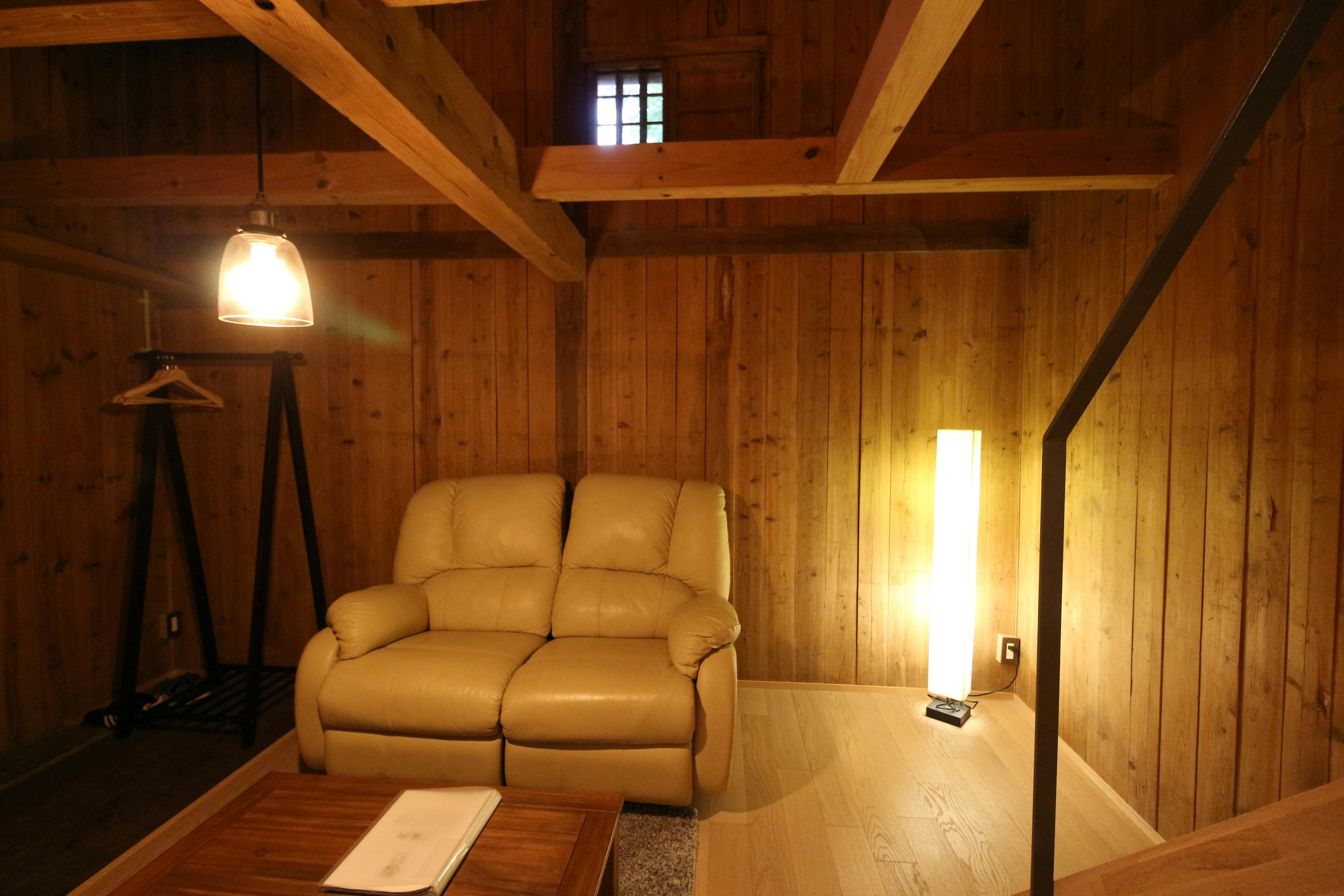 蔵一棟を改装した洋風のお部屋です。2階建てで1階部分がリビングとバス・洗面・トイレ、2階がベッドルームです。バスルームには専用ベンチがあり、オーバーヘッドシャワーを座って使うことができます。