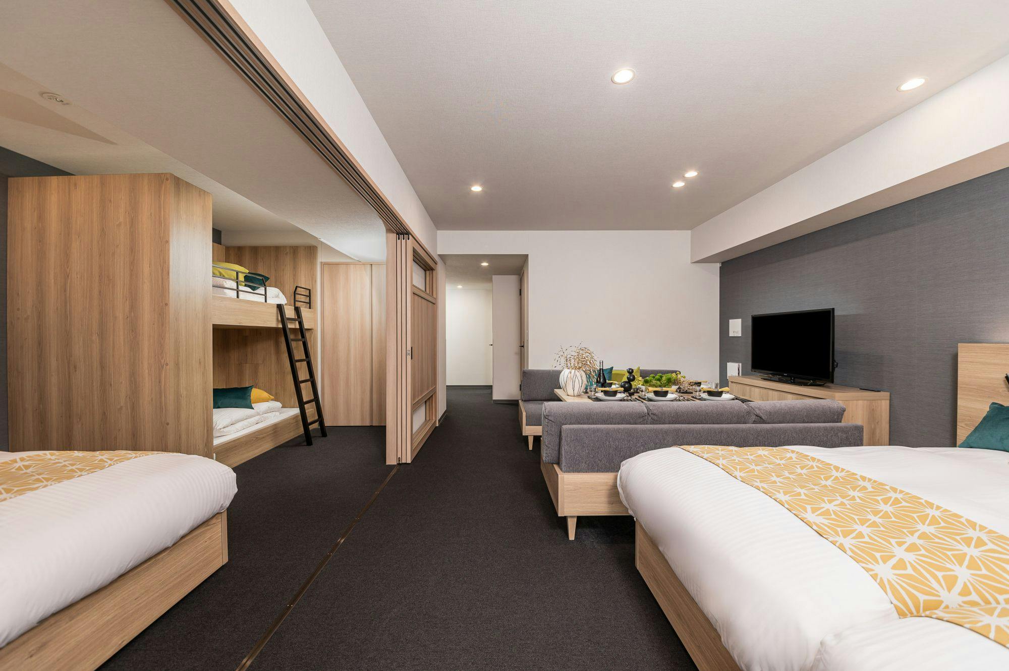 お子さまが喜ぶ2段ベッドをご用意しております。またベッドルームとリビング空間を間仕切りで仕切れるのでご家族・グループで就寝のお時間が異なる場合でも快適にお過ごしいただけます。