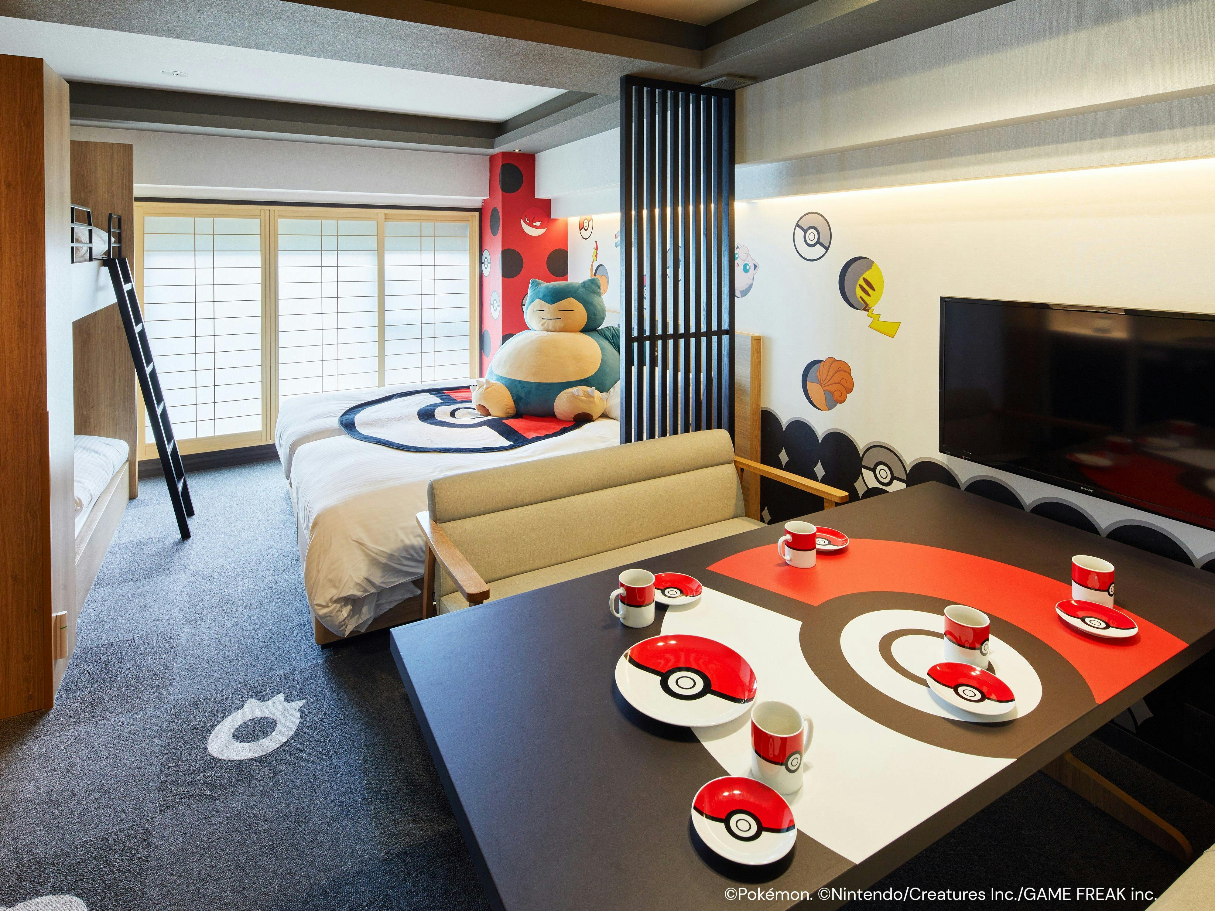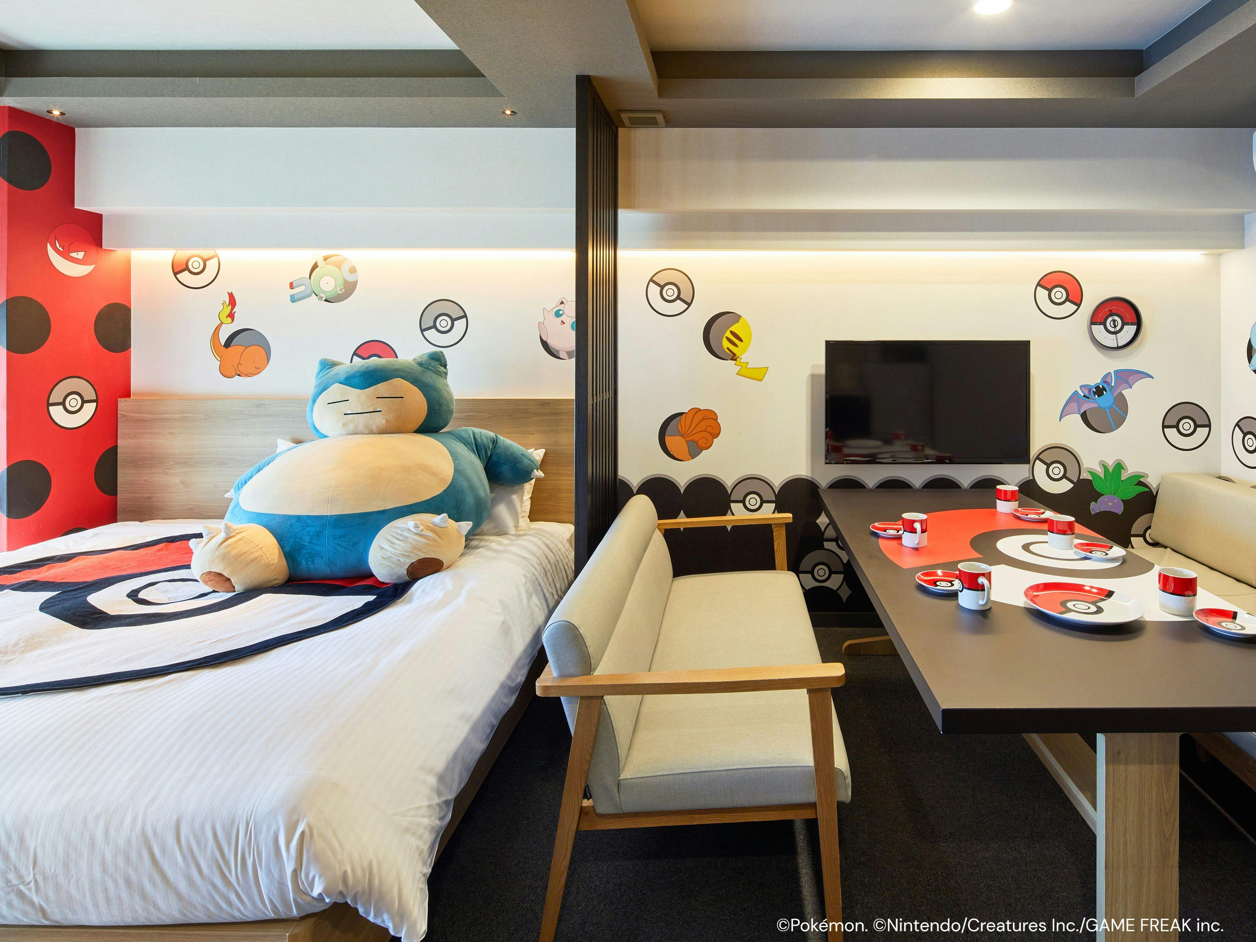 ポケモンルームでは、ダイニングスペース、ベッドスペースにモンスターボールをデザインモチーフとした壁紙を設え、巨大なカビゴンのぬいぐるみをご用意しています。