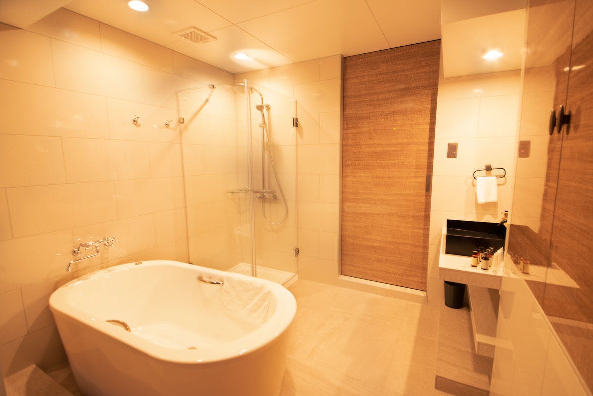 【部屋設備】・ドラム式洗濯乾燥機(洗剤・柔軟剤付)、個別空調、IHキッチン、テレビ(Netflix、youtube視聴可)、電気ポット、冷蔵庫、除加湿空気清浄機、Bluetooth接続スピーカー、セーフティボックス、ドライヤー、シューズドライヤー、ヘアアイロン、フットマッサージャー、ヘルスメーター、USBコード、アダプター、ボディーソープ・シャンプー・コンディショナー、洗顔ソープ、ハミガキセット、タオル、ボディタオル、レディースセット(コットン)