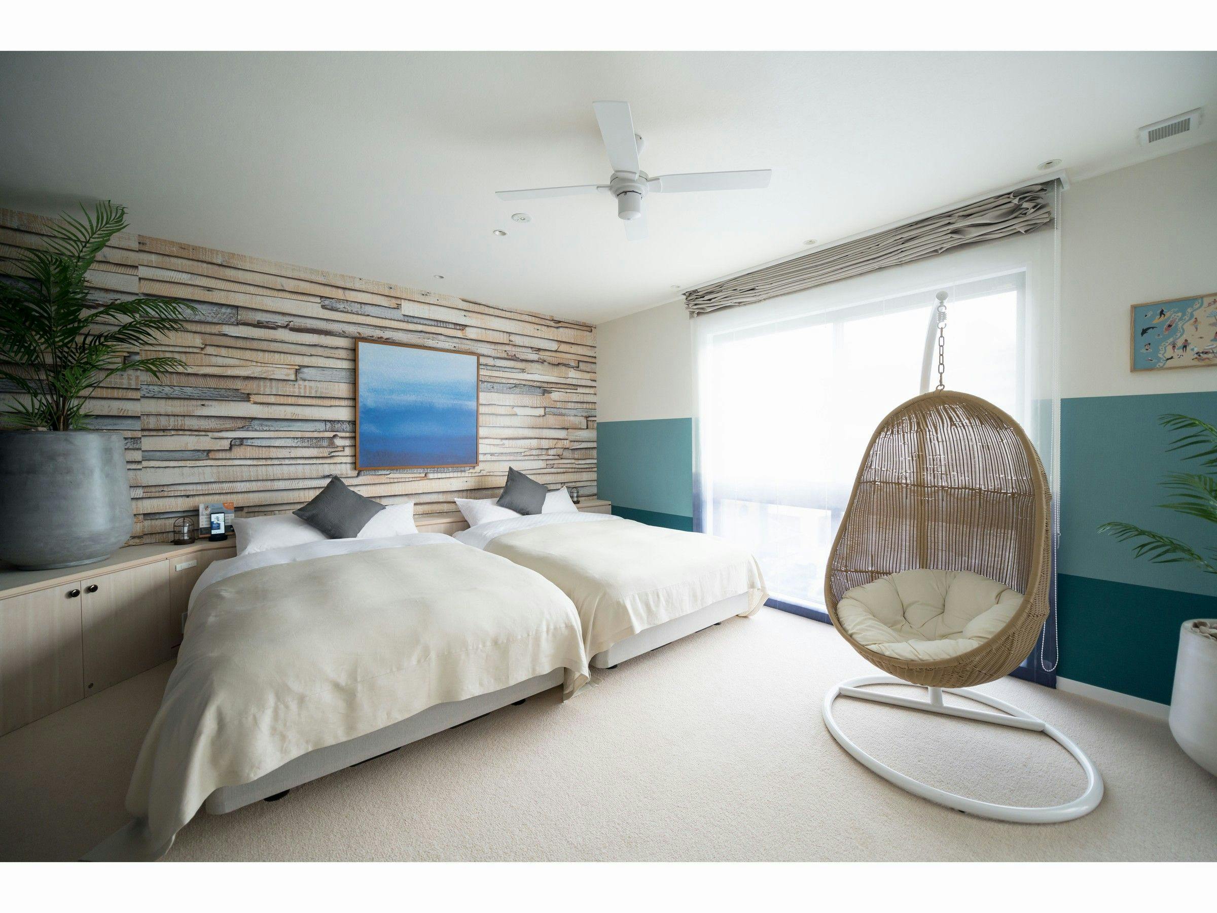 太陽の光が心地よく、あたたかく明るい空間はHAWAIを思わせる開放感。たっぷりと京都を楽しんだ夜は、ハンギングチェアにゆられてゆっくりとリラックス。