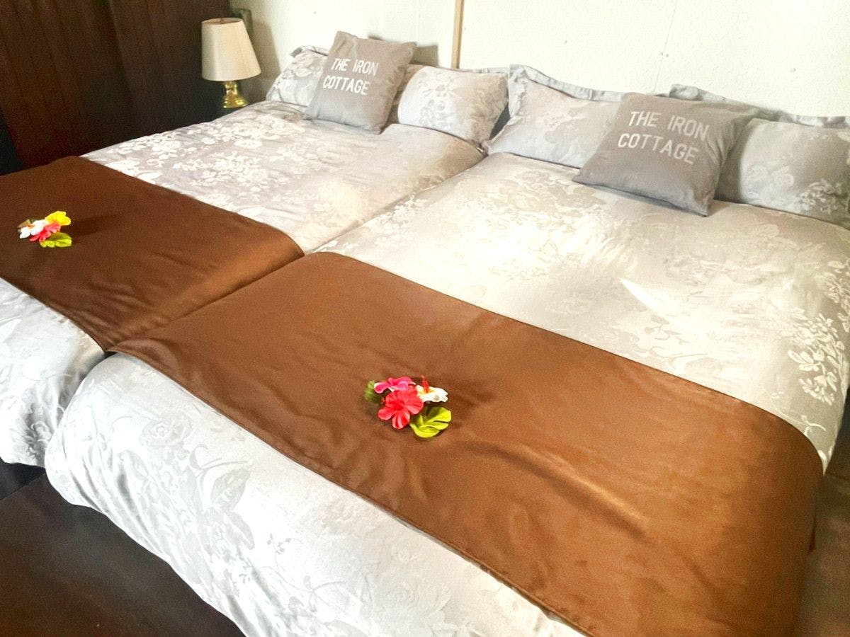 ■間取り:メインルーム、キッチン、トイレ・バスルーム、ウッドテラス■無料Wi-Fi完備■寝具はセミダブルベッド2台(添い寝幼児2名までOK)■コテージエントランス前にBBQコテージ■アメニティ:ボディーソープ、シャンプー&コンディショナー、ハミガキセット、カミソリ、くし、タオル。バスタオル、スリッパ
