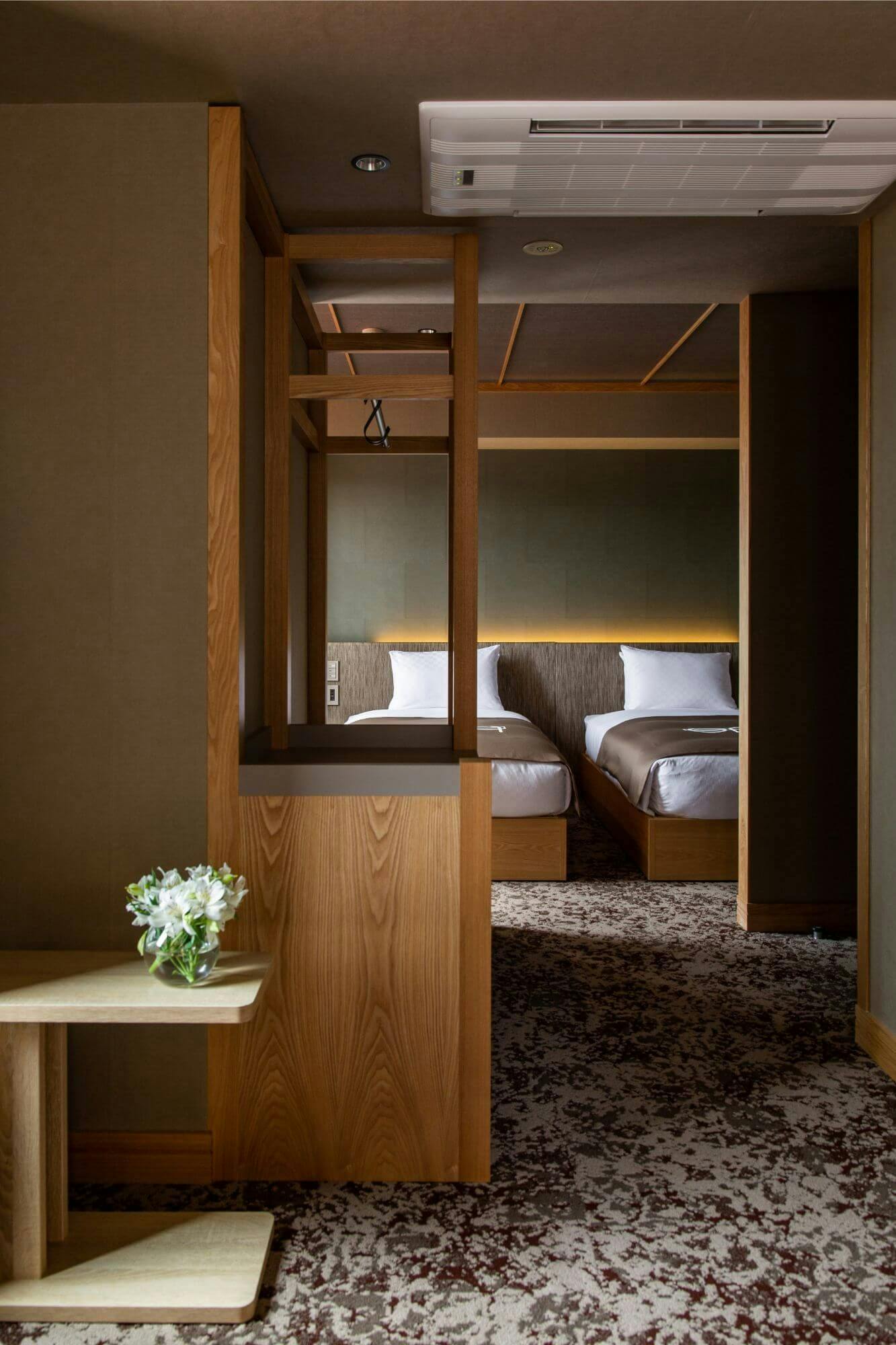 ※最大2名様+添い寝2名様(5歳以下のお子様※お食事布団無し)までご利用いただけます。※添い寝ご希望のお客様はご予約ページにて質問事項にご記入をお願い致します。・部屋高山の自然を感じられる落ち着いたデザインのお部屋。ゆったりとしたハリウッドツインベッドをご用意。・洗面 浴室広々とした浴室、洗面台やウォシュレット付きトイレ等、設備も充実。