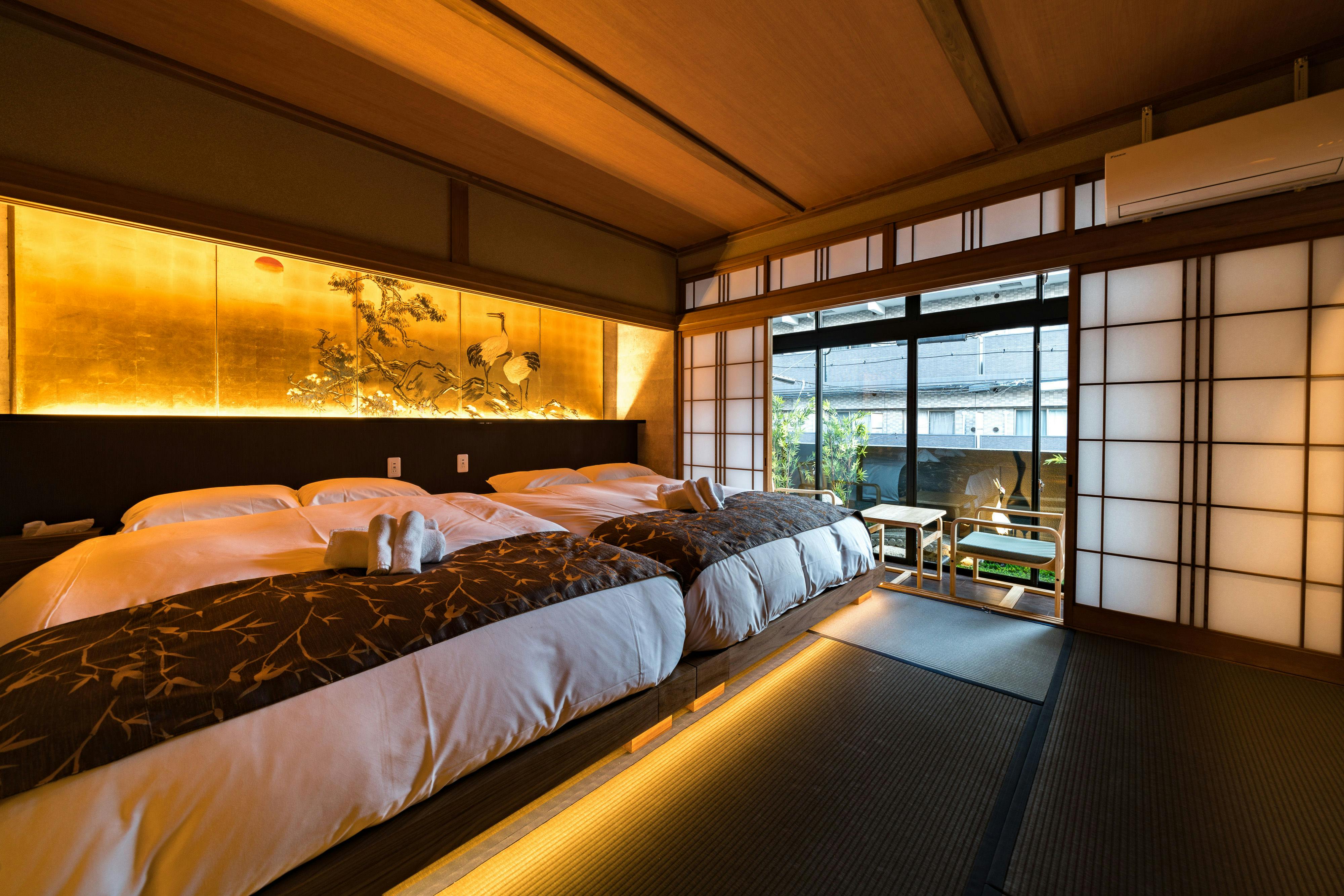 「今昔荘 大阪城南」は、猪甘津橋に集まった鶴をデザインコンセプトにした宿です。 畳や日本庭園を眺める半露天風呂、アメニティや家電から日本の「昔」と「今」を体感できる宿として作られました。