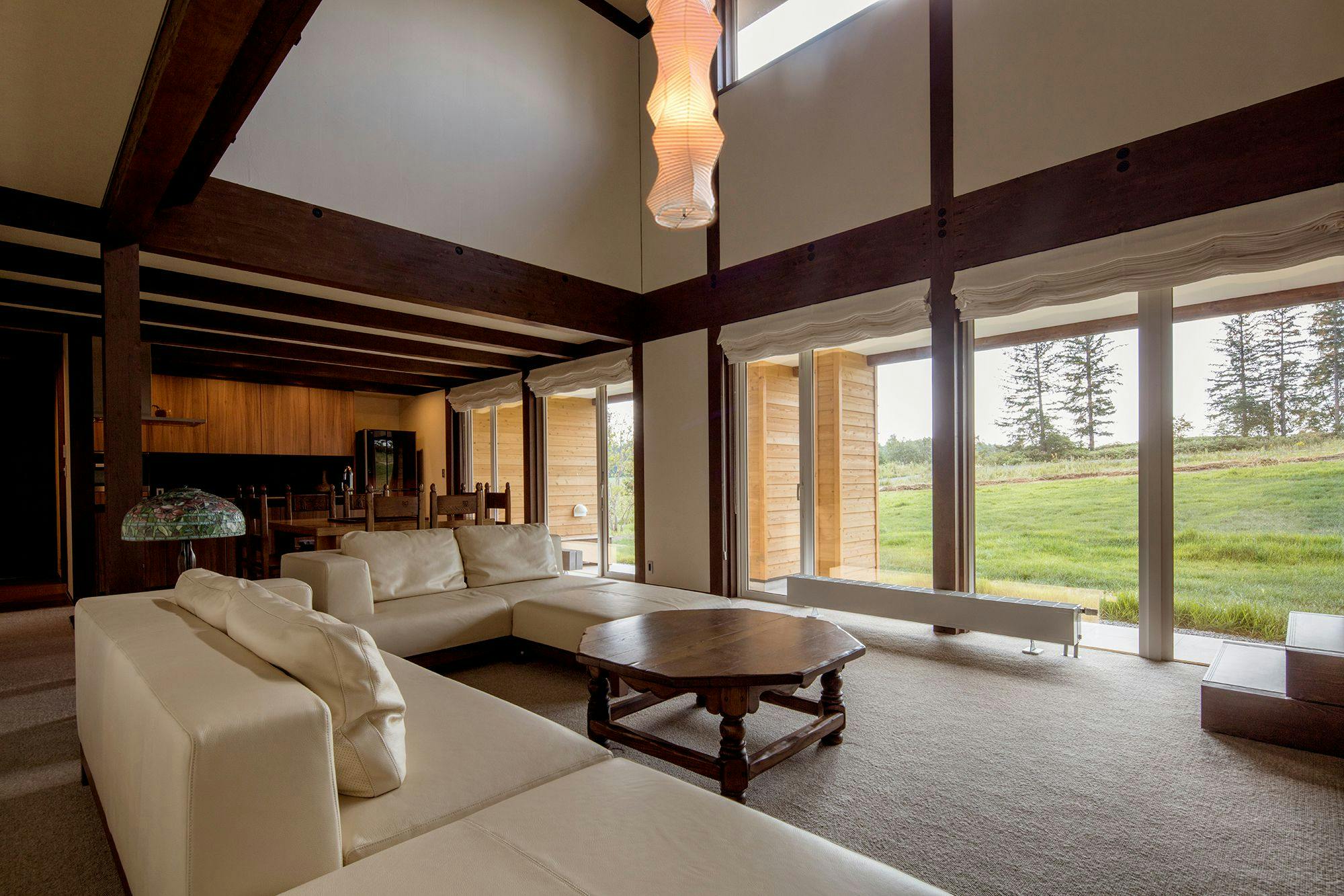 広大な敷地内に聞こえるのは木々を渡る風の音と鳥たちのささやきだけです。エントランスのカツラの木が印象的な瀟洒な建物はギャンブレル・ルーフのデザインが施され、美瑛の風景に溶け込んでいます。