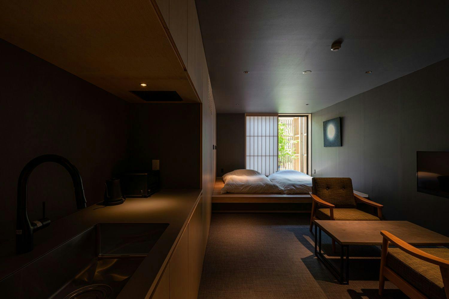 「群青の月」は室数3室の新築旅館です。金沢の伝統的な街並みに溶け込むように町家建築の雰囲気を取り入れながら、室内は最新の設備を整えた快適空間となっております。
