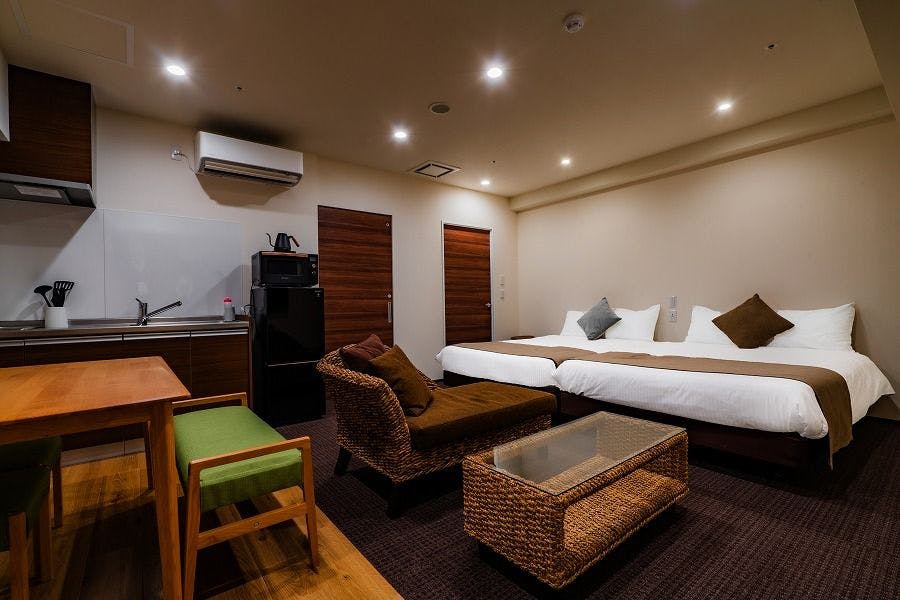 【部屋内設備】;一部お部屋のみ洗濯機(洗濯機についてはお問い合わせください) 大画面スマートテレビ、エアコン、キッチン、キッチン用品(お鍋、お皿、コップ、フライパン、お箸、スプーン、フォーク、フライ返し、お玉,,,etc)、電子レンジ、冷蔵庫、スパ付きお風呂(※ユニバーサルルームは除く)、ヘアドライヤー、アメニティ(洗顔フォーム、ハブラシ、コットンセット、くし、髭剃り、ボディースポンジ)お部屋は電子ダイヤルキーとなっておりますので、鍵を失くす心配もご無用。