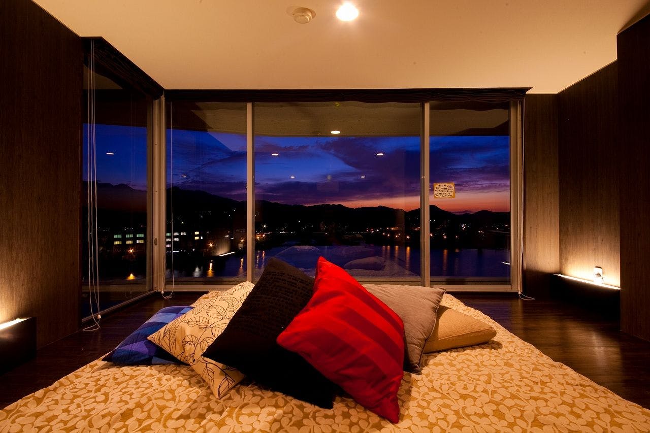 茶室風な畳の部屋、床の間のある広間、ベットがある寝室にも欄間の建具から灯りがこぼれたりと、日本の文化をしっかりと感じることができる寛ぎ空間になっています
