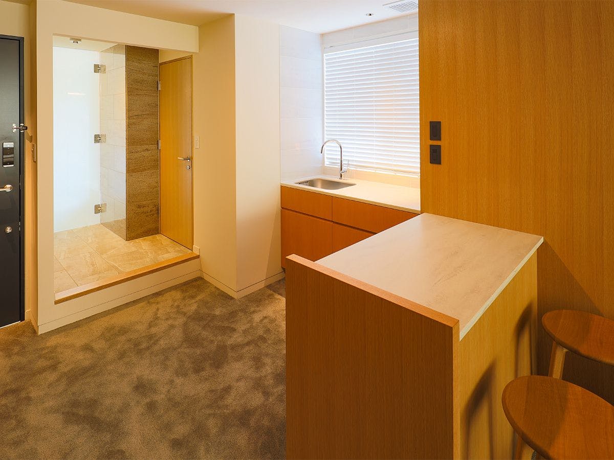 浴室には水量十分なオーバーヘッドシャワー、リビングにはミニキッチンを設置。