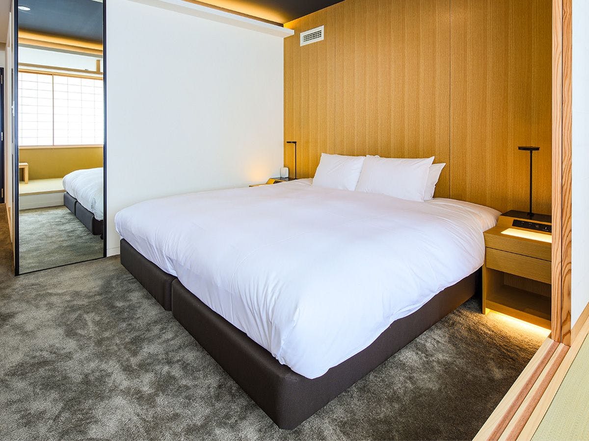 キングサイズベッド1台+畳のスペースへお布団2組のプレミアスイート。