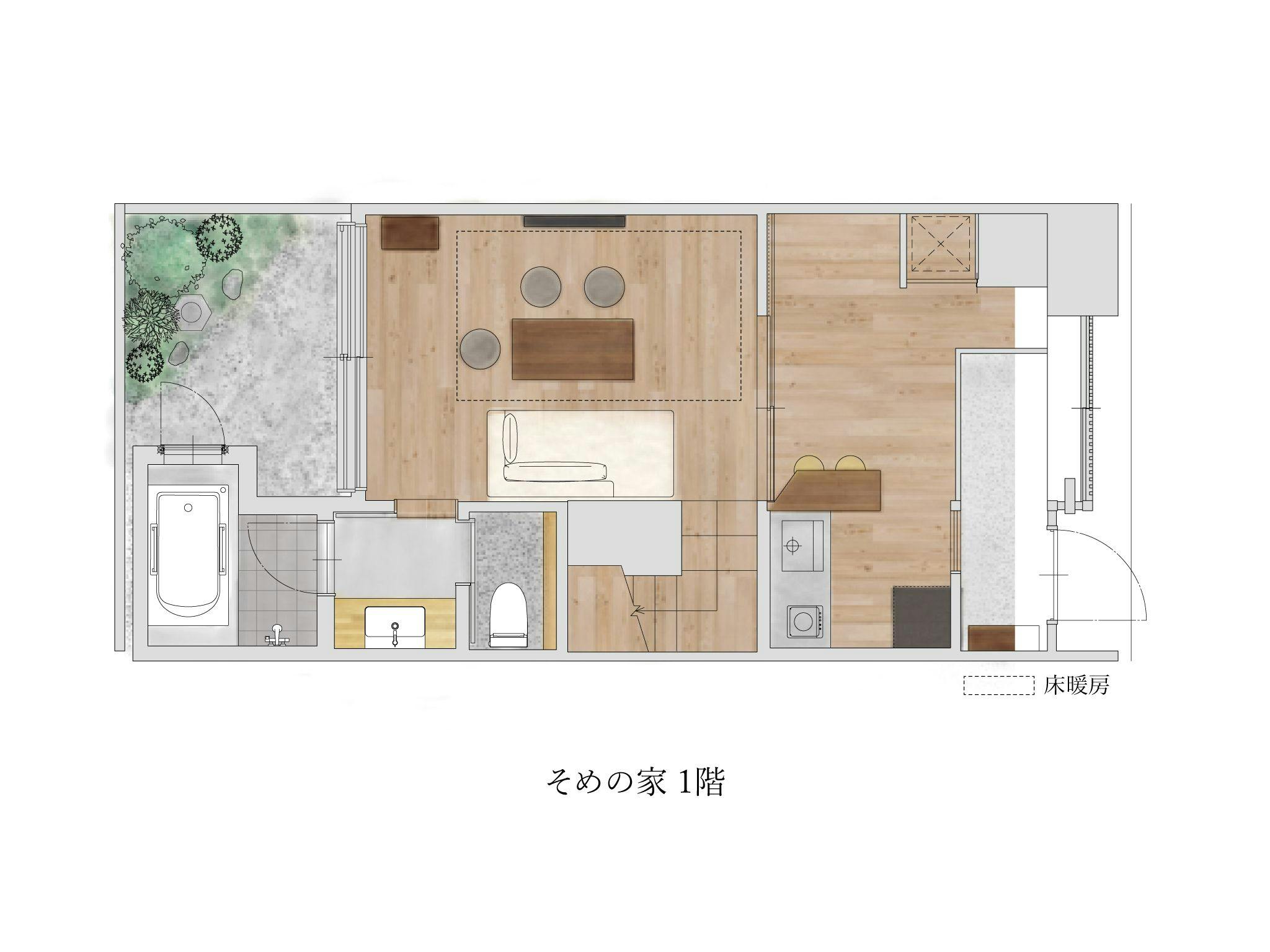 1階:リビング、ダイニングキッチン、バスルーム、パウダールーム、トイレ